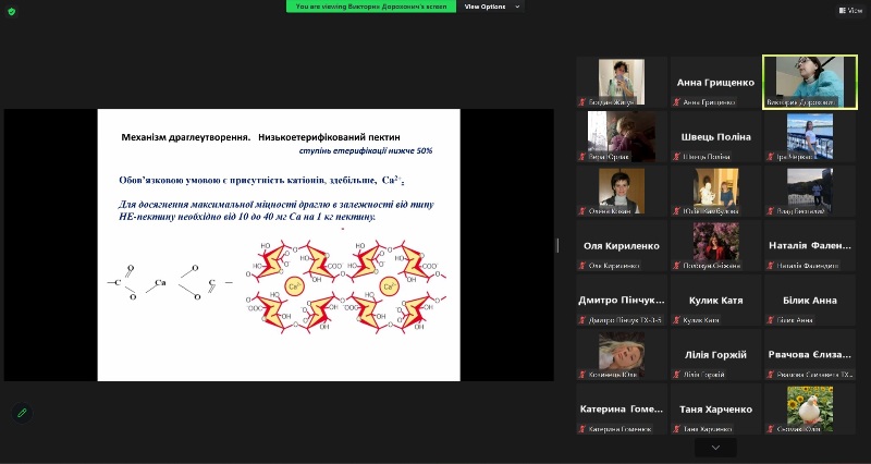 Лекція була прочитана на високому методичному рівні та супроводжувалася мультимедійною презентацією. Лекторка постійно підтримувала контакт із аудиторією, наводила приклади різних виробничих ситуацій, пов’язаних із проблемами драглеутворення мармеладних мас. На завершення лекції був приділений час для закріплення матеріалу, обговорення теми та надання відповідей на запитання студентів.