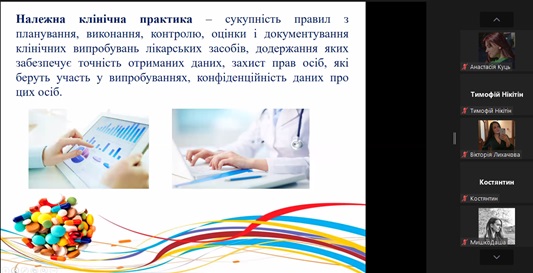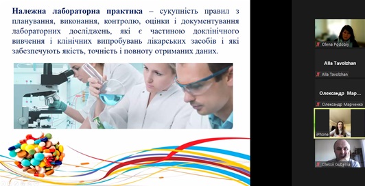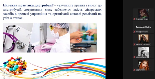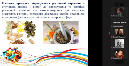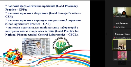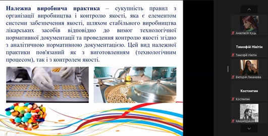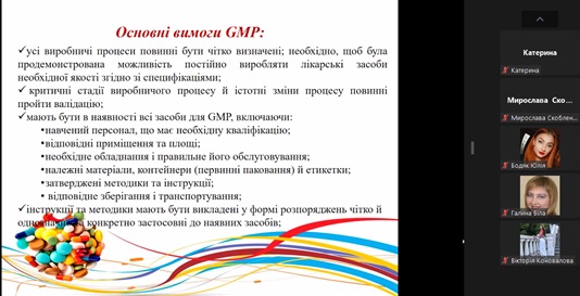Експертка зауважила, що створення, виробництво, реалізація відомих і нових продуктів – складна, тривала процедура, яка охоплює організацію процесу згідно з належними практиками, вимогами, правилами та настановами на кожному етапі. Доступно й послідовно про основні сегменти належних практик і настанов фахівчиня розповіла здобувачам освіти. Розглянула основні вимоги GMP, взаємозв'язок Належних фармацевтичних практик у забезпеченні якості лікарського засобу. Лекторка наголосила на тому, що всі сегменти належної практики важливі, адже всі вони є елементами забезпечення якості отриманої продукції.