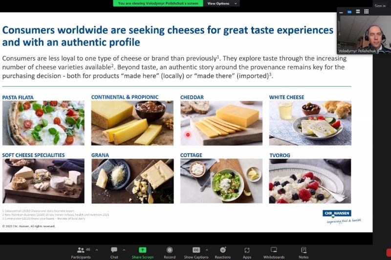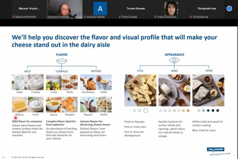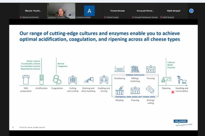 Була представлена поетапна схема виробництва сиру, на якій було наглядно показані всі етапи, на яких додаються стартові, функціональні чи захисні культури, сичужні коагулянти. Фахівець надав корисну інформацію стосовно різних культур, що використовуються у закваска різних типів, і продемонстрував схему основних біохімічних шляхів дозрівання сиру, які відрізняються залежно від обраних культур.