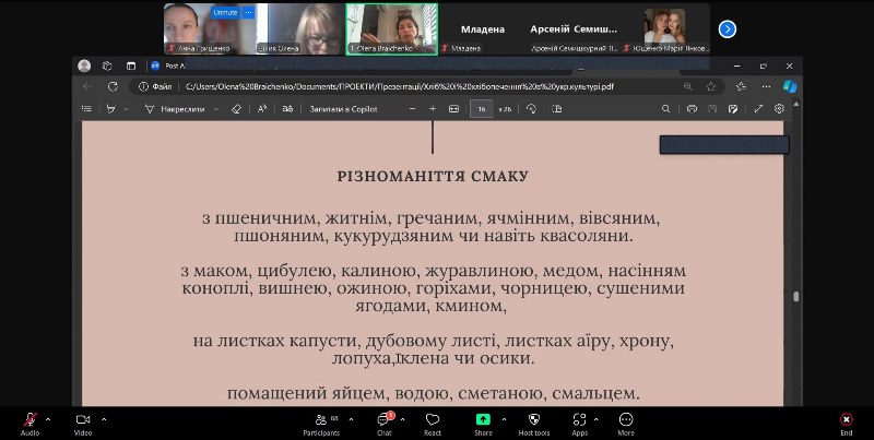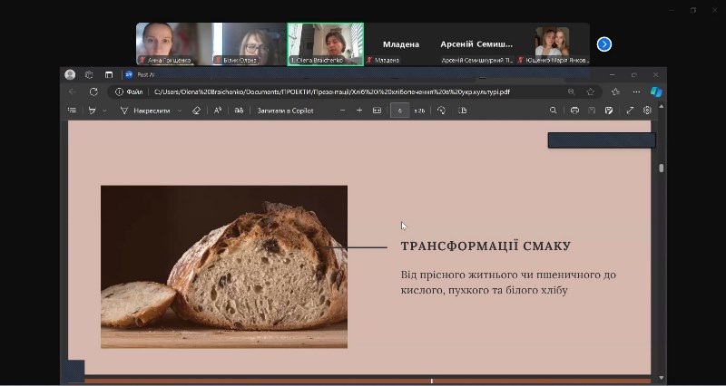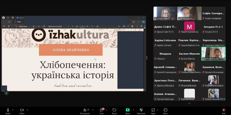 Лекторка розповіла про результати своїх досліджень стародавніх традицій хлібопечення на теренах України, особливості традицій у різних регіонах. Зокрема, здобувачі вищої освіти дізналися про стародавні пшениці, які вирощували наші предки та пекли особливо корисний хліб.