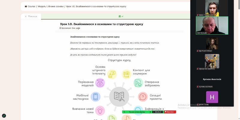 Курс був орієнтований на розвиток цифрових компетентностей, пов’язаних із використанням ШІ у освітній і професійній діяльності, незалежно від попереднього рівня підготовки здобувачів освіти. Програма курсу складалася з шести модулів, які охоплювали різні рівні взаємодії з інструментами штучного інтелекту – від базових понять до створення та навчання власних ШІ-асистентів із урахуванням актуальних тенденцій розвитку галузі.