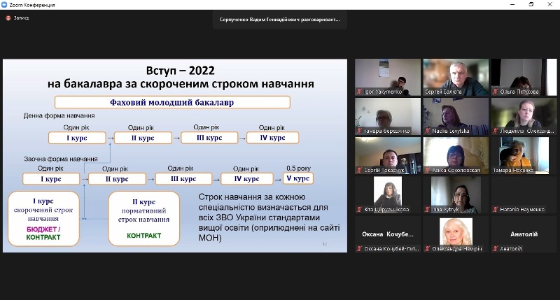 Про особливості вступної кампанії 2022 року розповів відповідальний секретар приймальної комісії, доцент Вадим Серпученко. Фахівець окреслив відмінності цьогорічної вступної кампанії, зокрема йшлося про вступ на основі національного мультипредметного тесту та мотиваційного листа усіх категорій вступників, розрахунок конкурсного балу, дати та етапи вступної кампанії. Багато новацій у вступі-2022 буде для випускників коледжів, що вступатимуть на освітній ступінь «бакалавр» на основі здобутого ступеня «молодший спеціаліст». Зокрема, вони не задаватимуть фахові вступні випробування в університеті, а вступатимуть за результатами НМТ 2022 року або двох предметних оцінок ЗНО 2019-2021 років. Також для цієї категорії вступників вперше застосовуватиметься принцип «місце йде за вступником».