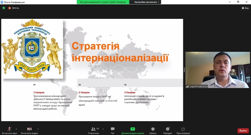 Проректор з наукової роботи, доцент Сергій Токарчук доповів з питання «Інтернаціоналізація освітньо-наукової діяльності університету: стан та перспективи розвитку». Він проаналізував усі аспекти міжнародної діяльності університету, навів дані, щодо виконання спільних міжнародних наукових досліджень, участі у проєктах програми Еразмус+, ініціативі «Єднання», кількості лекцій, прочитаних нашим здобувачам освіти зарубіжними фахівцями, закордонних стажувань наших викладачів і здобувачів освіти, позицій університету у міжнародних рейтингах тощо. Також проректор повідомив, що кількарічна кропітка праця зі включення наукового журналу університету «Ukrainian Food Journa» до наукометричної бази Scopus успішно завершена й нагадав, що публікації у ньому безкоштовні.