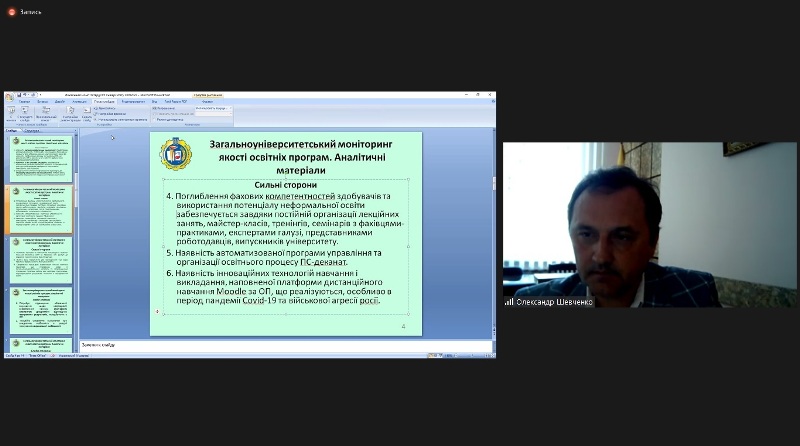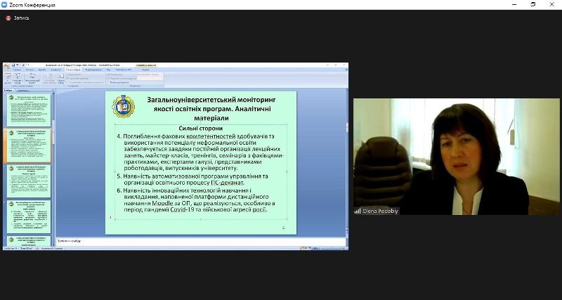 Далі у виступі Олени Подобій йшлося про затвердження нових редакцій освітніх програм підготовки здобувачів вищої освіти та навчальних планів 2022 року. На підставі проведеного моніторингу та періодичного перегляду освітніх програм із врахуванням рекомендацій різних груп стейкхолдерів були надані пропозиції щодо затвердження освітніх програм, закриття однієї магістерської програми та відкриття двох нових освітніх програм – магістерської і бакалаврської. Також директорка Центру назвала чотири магістерські програми, що перебувають у групі ризику через гранично низьку кількість зацікавлених здобувачів освіти. Крім того, вона довела до відома присутніх, що освітні програми двох відокремлених структурних підрозділів – Свалявського технічного фахового коледжу НУХТ і Кам’янець-Подільського фахового коледжу харчової промисловості НУХТ також пройшли всі етапи обговорення та погодження й можуть бути затверджені.