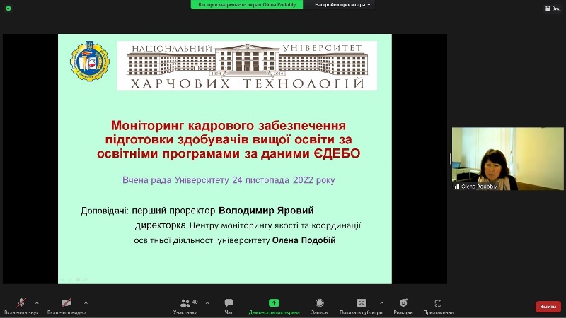 Про результати моніторингу кадрового забезпечення підготовки здобувачів вищої освіти за освітніми програмами за даними ЄДЕБО йшлося у доповіді першого проректора Володимира Ярового і директорки Центру моніторингу якості та координації освітньої діяльності університету Олени Подобій. Було наголошено, що забезпечення відповідності науково-педагогічних працівників освітнім компонентам, які вони викладають, а також наявність у них досягнень у професійній діяльності відповідно пп. 37 і 38 Ліцензійних умов провадження освітньої діяльності (не менше 4 пунктів досягнень у професійній діяльності за останні п’ять років), є актуальним стратегічним завданням. Доповідачі нагадали, що у поточному навчальному році заплановано провести акредитацію 17 освітніх програм підготовки бакалавра, 18 освітніх програм підготовки магістра та 4 освітньо-наукових програм підготовки доктора філософії, а питання відповідності кадрового складу є одним із визначальних при ухваленні рішення про акредитацію. Тому керівники структурних підрозділів мають систематично перевіряти достовірність внесених даних стосовно відповідності науково-педагогічних працівників дисциплінам, які вони викладають на освітніх програмах, та у разі необхідності оперативно оновлювати їх досягнення у професійній діяльності у Єдиній державній електронній базі з питань освіти.