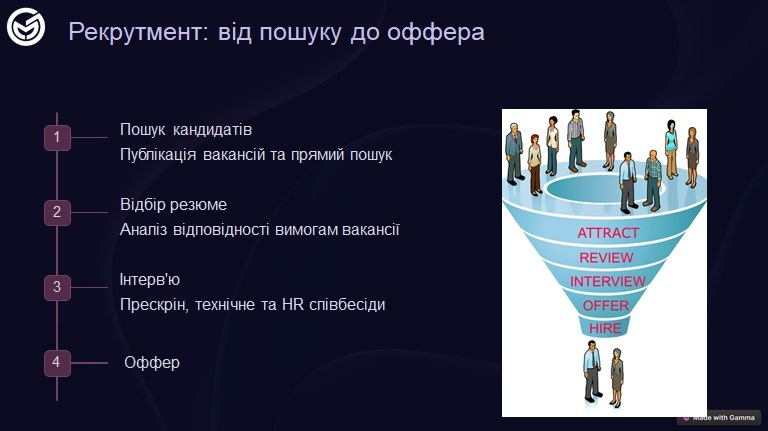 Лекторка розкрила підходи до менеджменту персоналу в компанії Global-Mediator, що фокусуються на розвитку людського капіталу, підвищенні мотивації та залученості співробітників, а також на адаптації до швидко змінюваного бізнес-середовища. Також фахівчиня розповіла про основні етапи менеджменту персоналу та визначила їх особливості в ІТ-сфері.