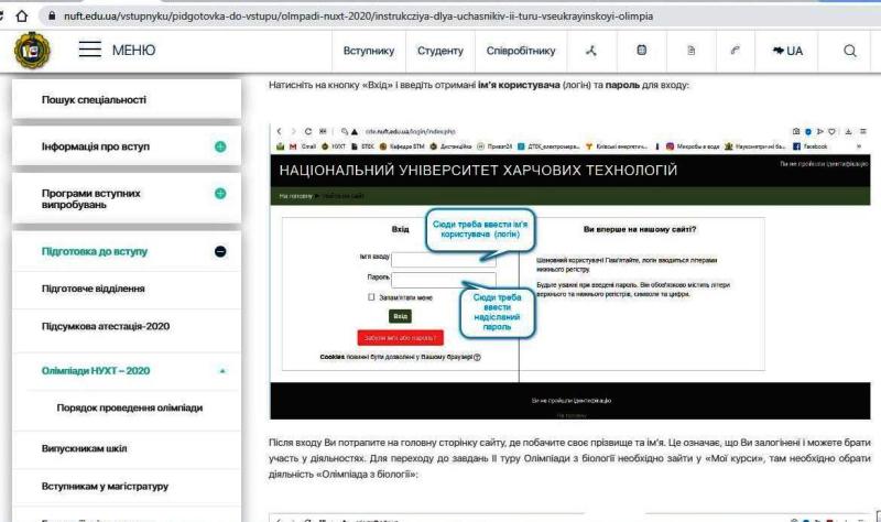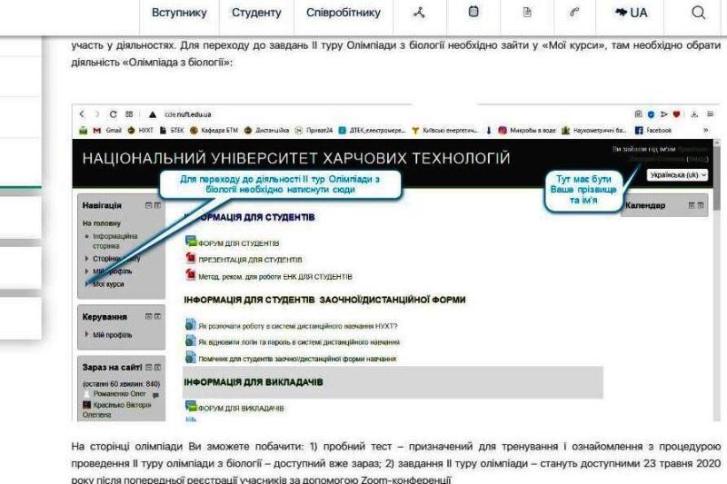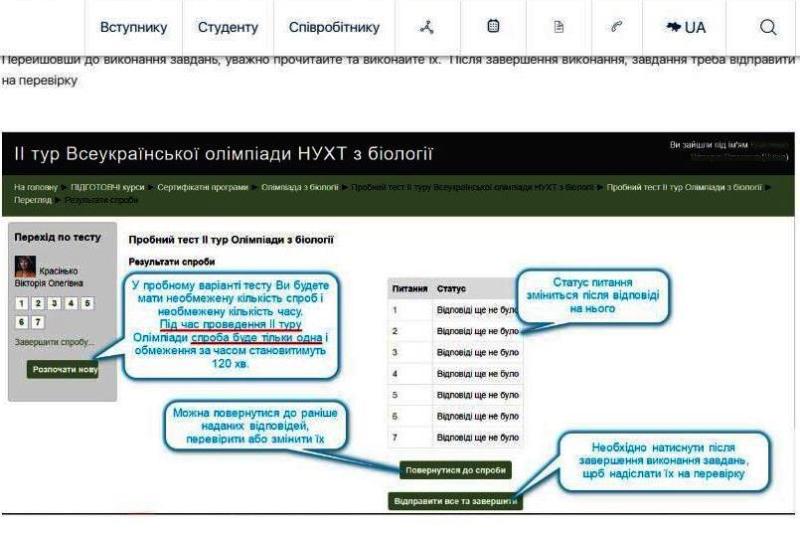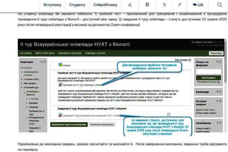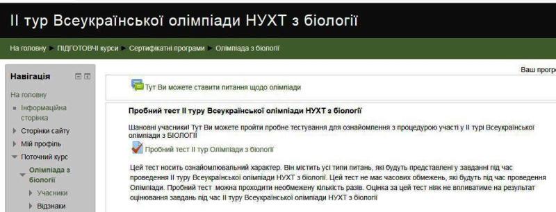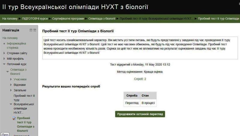 Для початку учасники мають до 22 травня зареєструватися в особистому кабінеті, для чого приймальною комісією НУХТ розроблена відповідна інструкція. Нині для учасників розроблена і детальна інструкція для виконання олімпіадних завдань на платформі Moodle, і скоро вона буде розміщена на сторінці ІІ туру олімпіади. На сьогодні учасники уже підключені до платформи Moodle, де вони можуть випробувати свої сили і виконати пробне завдання з біології.