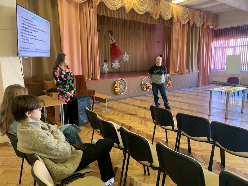 Далі відбулася профорієнтаційна лекція для учнів 11-х класів. Олег Кузьмін і Марія Омельченко розповіли школярам про університет, його історію, структурні підрозділи, освітні напрямки, унікальні спеціальності та програми, які пропонуються вступникам, а також про перспективи працевлаштування після завершення навчання. Окремо було висвітлено умови вступу у 2025 році та можливості, які пропонує підготовче відділення університету для тих, хто хоче підготуватися до вступу заздалегідь.