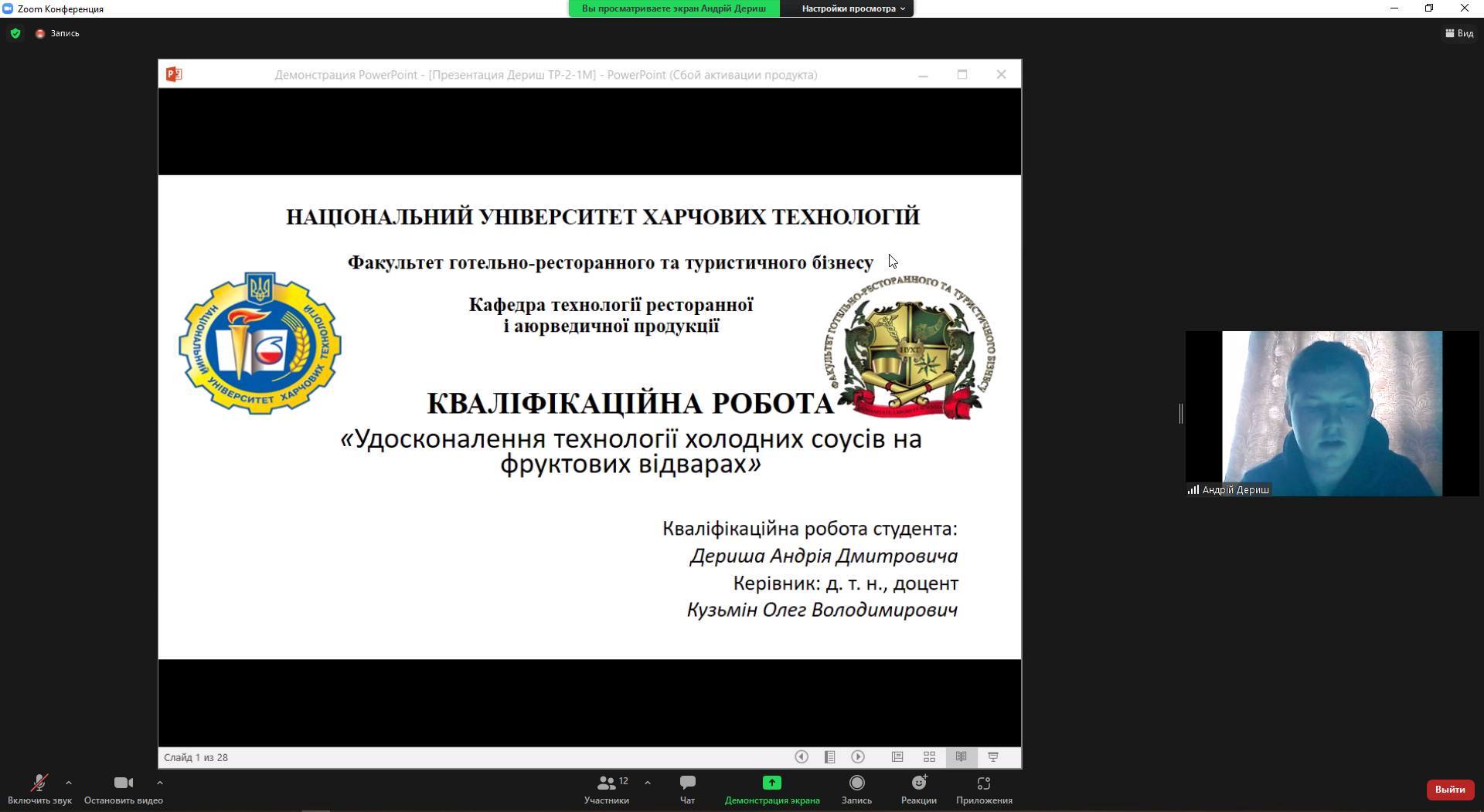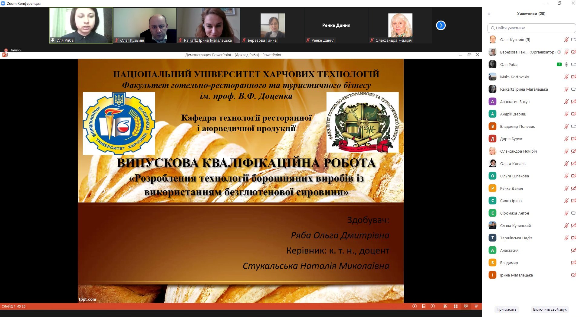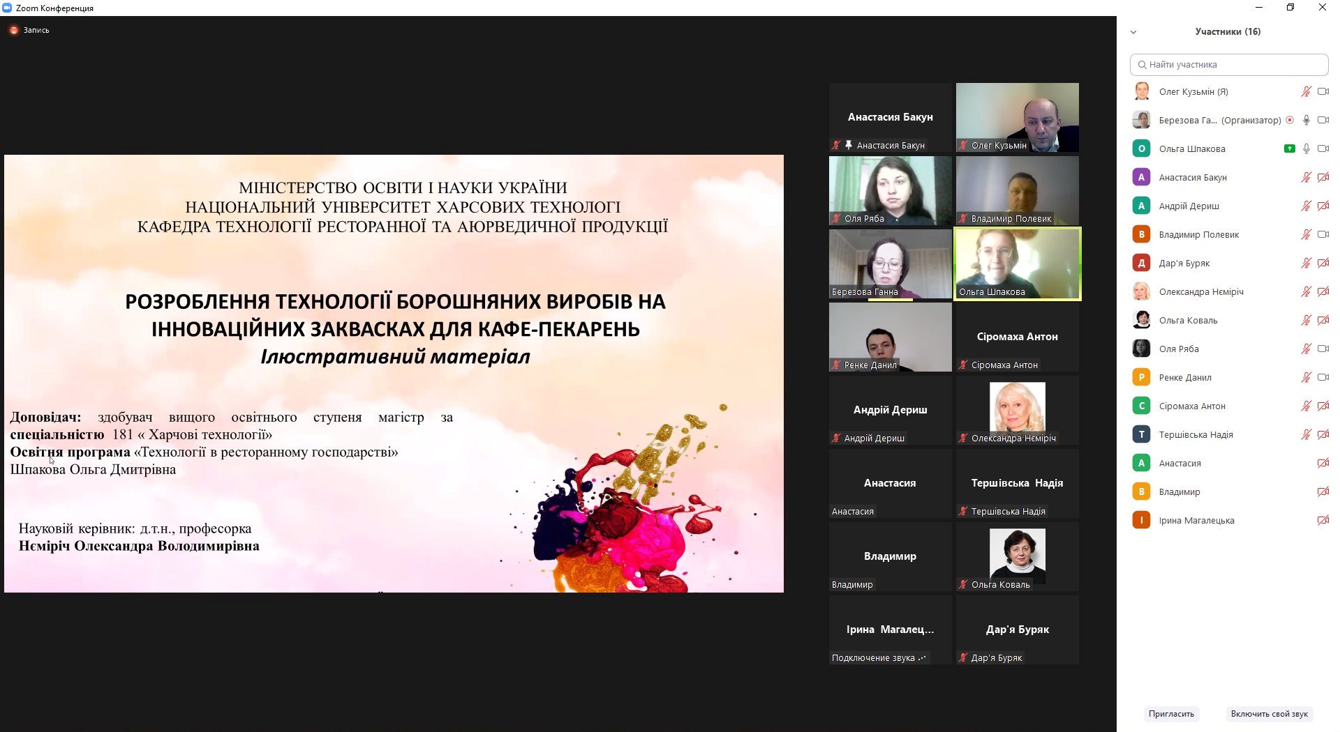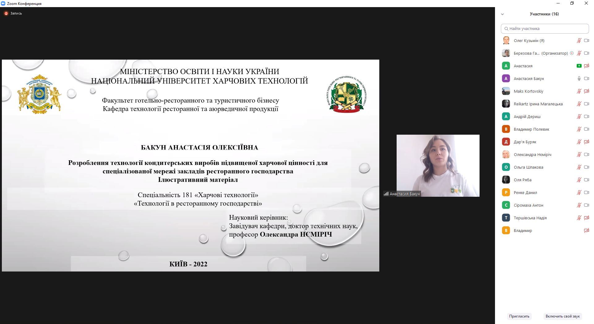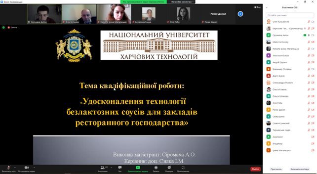 22 лютого 2022 року на кафедрі технології ресторанної і аюрведичної продукції продовжилися захисти кваліфікаційних робіт здобувачів освітнього ступеня «Магістр» за спеціальністю 181 «Харчові технології», освітньо-професійною програмою «Технології в ресторанному господарстві» денної форми навчання.