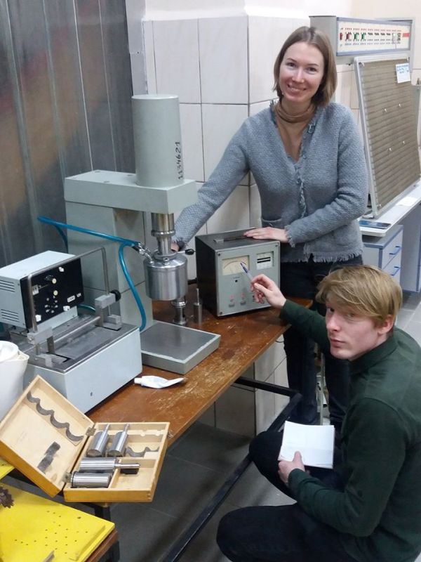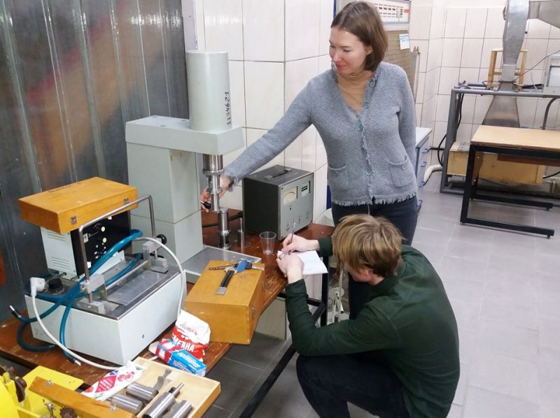 Магістрант Руслан Гордечук склав експериментальний стенд для дослідження процесів надтонкого подрібнення компонентів лікарських і косметичних засобів – мазей, паст, очних крапель, клітин мікроорганізмів, помад і під керівництвом аспіранта Катерини Грінінг проводить випробування і налаштування елементів стенду і приладів.