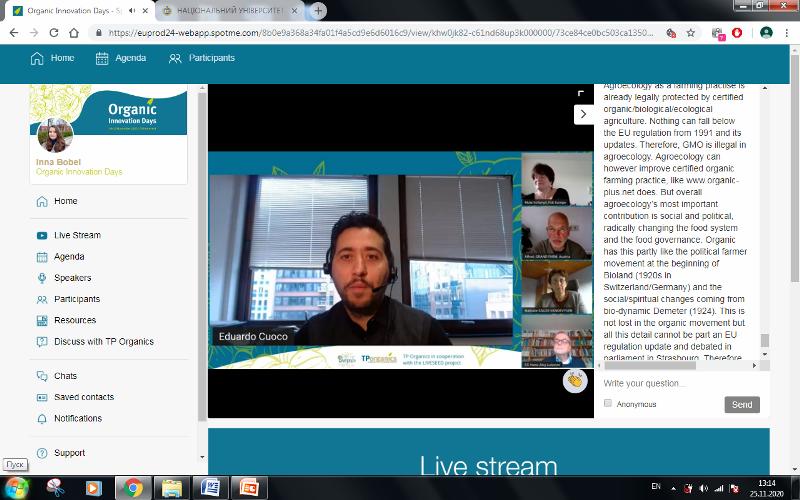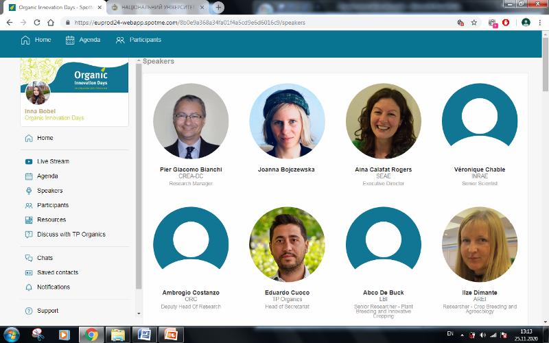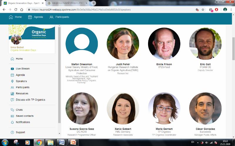 24-25 листопада 2020 р. доцентка кафедри технології хлібопекарських і кондитерських виробів Інна Бобель взяла участь в онлайн-заході «ORGANIC INNOVATION DAYS 2020» (м. Брюссель, Бельгія).