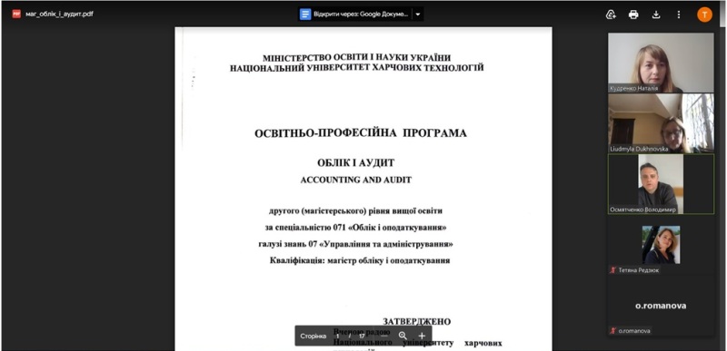 3 лютого 2023 року відбулося чергове засідання членів проєктної групи освітньо-професійної програми «Облік і аудит» за участю викладачів кафедри: гарантки освітньо-професійної програми бакалаврського рівня, доцентки Наталії Кудренко, гарантки освітньо-професійної програми магістерського рівня Людмили Духновської, професора Володимира Осмятченка, доценток Ольги Михайленко і Юлії Темчишиної, старшої викладачки Тетяни Редзюк та стейкхолдерів Ігоря Сича, Віктора Леха, Сергія Мозгового, Ольги Романової.