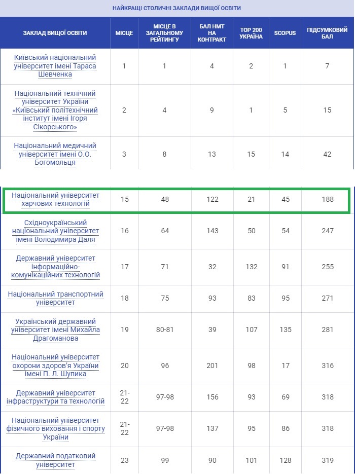 Крім того, у підрейтингу «Найкращі київські заклади вищої освіти», куди включені виші Києва та Київської області, що посіли найвищі місця в консолідованому рейтингу, ми займаємо 15-ту позицію з-поміж 65 ЗВО столиці й області.
