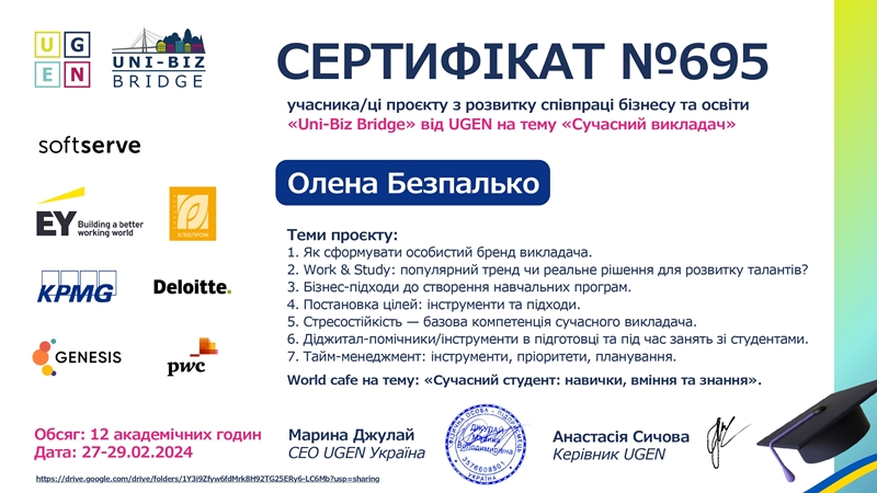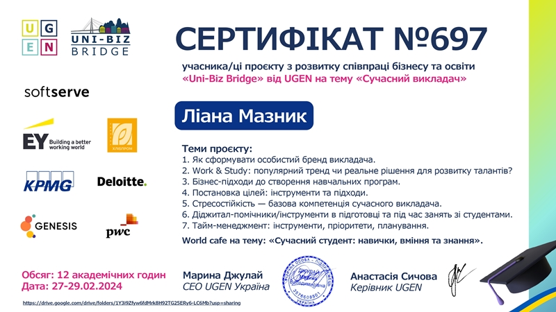 Викладачі кафедри економіки праці та менеджменту також взяли участь у проєкті, організованому командою UGEN «Uni-Biz Bridge «Сучасний викладач». Організатори продовжують використання цікавого формату щодо розвитку підходів у співпраці освіти та бізнесу, а також надали можливість попрактикуватись у напрямках: інструменти та методи формування особистого бренду викладача; визначитись із Work&Study (чи це просто популярний тренд, чи дійсно реальне і важливе рішення для розвитку талантів); постановка цілей: інструменти та підходи; стресостійкість – базова компетенція сучасного викладача; діджитал-помічники в підготовці та під час занять зі студентами; тайм-менеджмент: інструменти, пріоритети, планування.