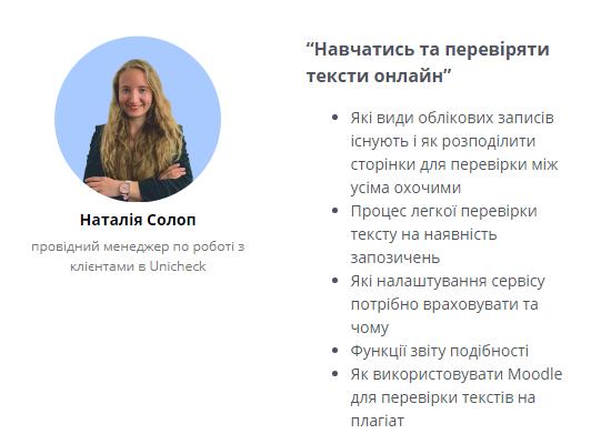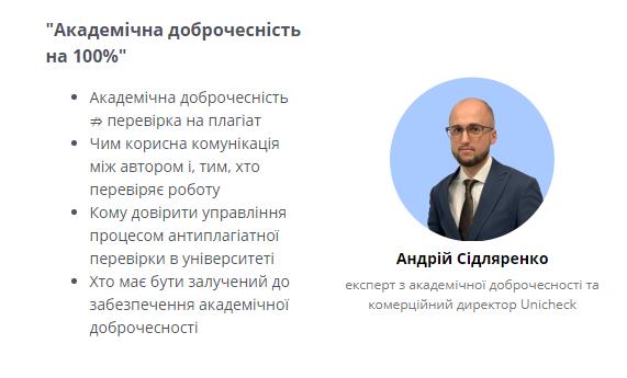 На вебінарі розглядалися різні аспекти перевірки текстів на наявність плагіату та запозичень. Спікери заходу, експерт з академічної доброчесності, комерційний директор Unicheck Андрій Сідляренко та провідна менеджерка по роботі з клієнтами в Unicheck Наталія Солоп розказали про кроки, які варто зробити, щоб полегшити перевірку текстів на наявність запозичень та плагіату, поділилися реальним досвідом закладів освіти у онлайн-перевірках і впровадженні академічної доброчесності.
