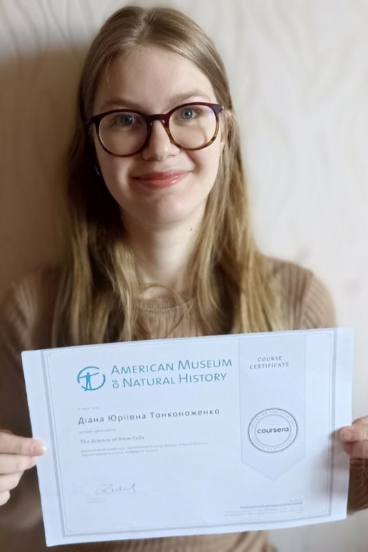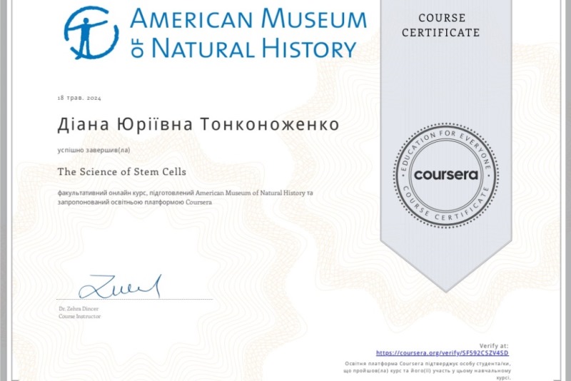 Завдяки партнерським зв'язкам університету з провідними західними установами, студенти для збагачення своїх знань і компетенцій можуть користуватися також потужною онлайн-платформою Coursera. Так, Діана на цій платформі пройшла курс «The Science of Stem Cells», розроблений для тих, хто хоче отримати фундаментальні знання про стовбурові клітини. Він може бути корисним як для студентів біологічних, так і медичних спеціальностей. Здобувачка отримала глибокі знання про стовбурові клітини, їх біологію та можливі застосування, що є важливими для розвитку сучасної медицини та біотехнологій.