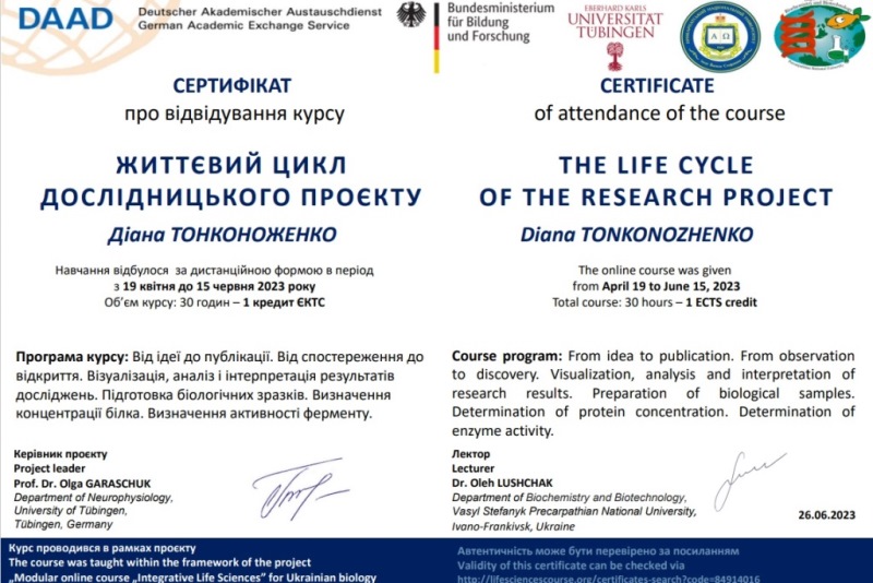 Зокрема, третьокурсниця освітньо-професійної програми «Біотехнології: фармацевтична, промислова, харчова, природоохоронна» Діана Тонконоженко скористалася нагодою пройти курс «Життєвий цикл дослідницького проєкту», метою якого було надання знань про ключові етапи реалізації наукового проєкту, включаючи ідеї, планування та виконання експериментальної частини. Була приділена увага основним навичкам і вмінням, необхідним для успішного виконання досліджень: використанню лабораторного обладнання, розрахункам наважок, приготуванню розчинів, вибору умов визначення активностей ферментів, веденню лабораторного журналу.