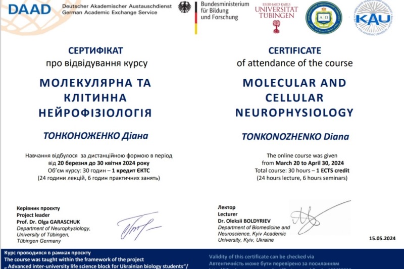 У п’ятому семестрі здобувачка обрала дисципліну вільного вибору «Прикладна біофізика», яку викладає лектор Ігор Якименко. Після закінчення вивчення цієї дисципліни її зацікавили біофізичні процеси в живих організмах, тому студентка вирішила додатково поглибити свої знання та пройшла курс «Молекулярна та клітинна нейрофізіологія», який проводився також за підтримки DAAD. Третьокурсниця ознайомилася з функцією нервової системи, нервових клітин, молекулярними процесами нервових взаємодій з ендокринною, імунною та статевою системами, а також із причинами загибелі нейронів за нейродегенеративних патологій.