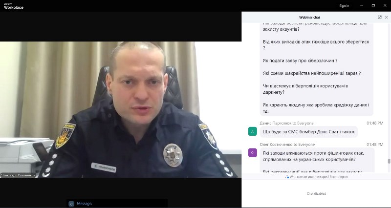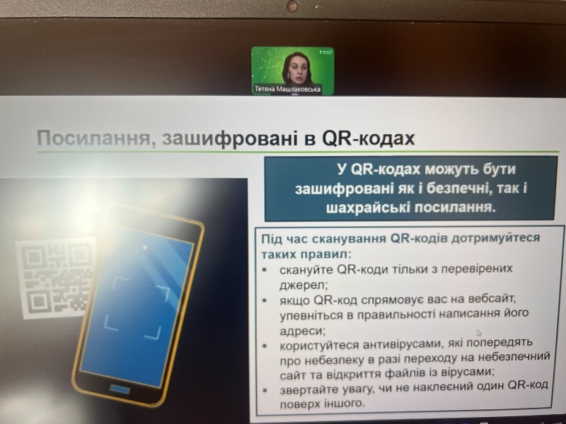 Студенти прослухали вебінари «Кібербезпека та актуальні схеми шахрайства» від головної експертки управління зв’язків з громадськістю та фінансової обізнаності НБУ Тетяни Машлаковської, «Платіжне шахрайство: досліджуємо разом з кіберполіцією» від підполковника поліції, начальника відділу протидії різновидам онлайн-шахрайств Департаменту кіберполіції Національної поліції України Олександра Ульяненкова та «Кібербезпека як професія майбутнього: актуальність, навички та кар'єрні можливості» від фахівця компанії ESET в Україні – провідного постачальника рішень із кібербезпеки Нікіти Веселкова.