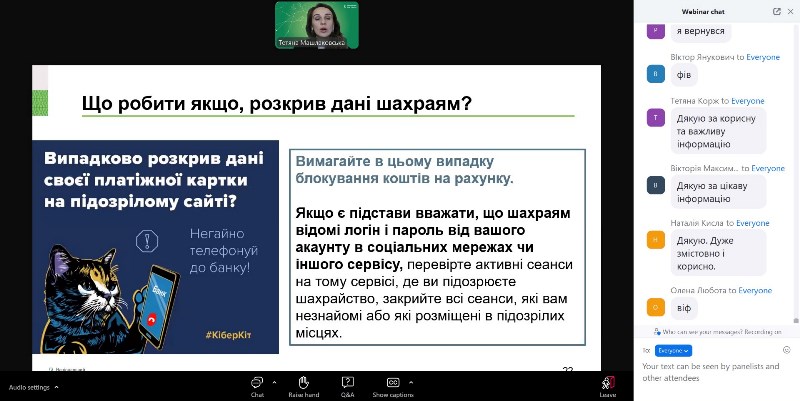 У епоху цифровізації та проникнення інтернет-технологій у всі сфери діяльності людства виникає багато питань, пов’язаних із безпекою в кіберпросторі. Учасники вебінарів дізналися багато цікавих фактів та отримали безліч корисних порад від фахівців, починаючи від простих питань щодо підходів до створення надійних і безпечних паролів, ідентифікації сумнівних сайтів, до складних питань уникнення шахрайств при виконанні платіжних операцій. Цікавою була й інформація про професіоналів, які працюють у сфері кібербезпеки та захищають наших співгромадян від різних кібер-шахраїв.