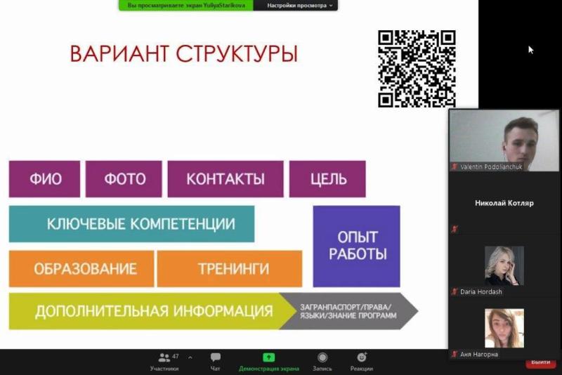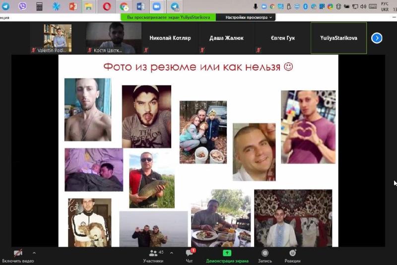 Також були розглянуті деякі аспекти складання резюме молодими спеціалістами: студенти не тільки дізналися, яких помилок не варто допускати, але і ознайомилися зі структурою правильно складеного резюме. Також, за допомогою онлайн-опитування, учасники тренінгу поділилися думками: як же саме має виглядати ідеальний кандидат без досвіду роботи.