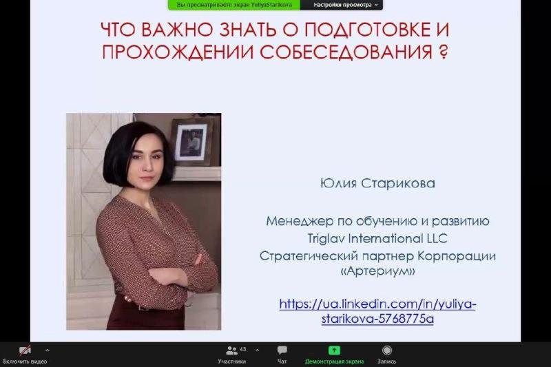 І зараз, незважаючи на карантинні обмеження, для здобувачів 4 курсу тренеркою ТОВ «TRIGLAV INTERNATIONAL» (стратегічний партнер Корпорації «Артеріум»), менеджеркою з навчання та розвитку персоналу, експерткою з ділових комунікацій та переговорів Юлією Стариковою був організований майстер-клас «Підготовка до співбесіди та її успішне проходження». Модератором заходу виступила випускниця факультету, нині фахівець з розвитку персоналу корпорації «Артеріум» Наталія Корх.