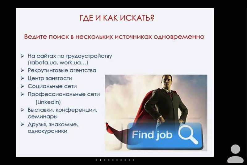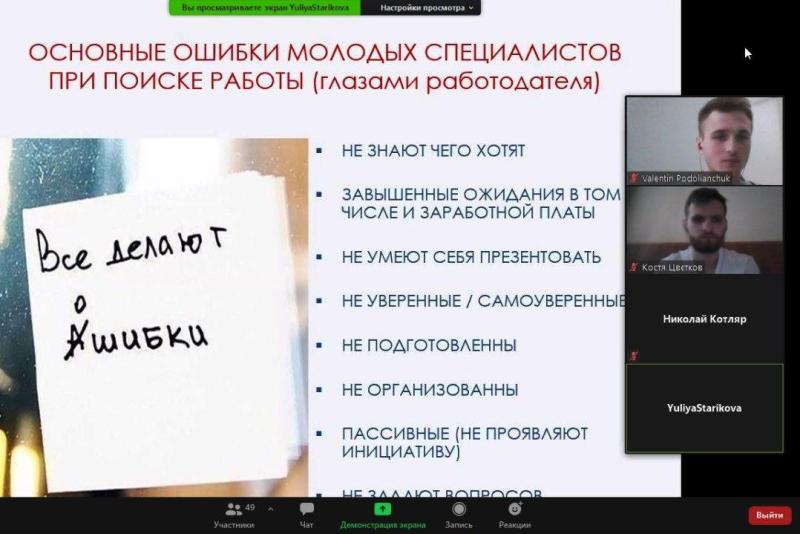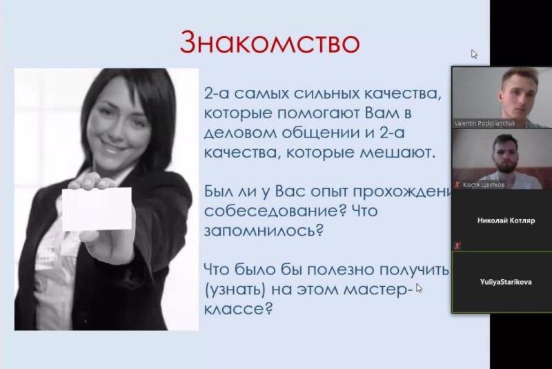 У ході майстер-класу Юлія Старікова зрозуміло та цікаво розповіла слухачам про основні аспекти підготовки та проходження співбесіди при зустрічі з роботодавцем; про інформацію, яку потрібно готувати для ділової зустрічі та про найбільш поширені помилки претендентів.