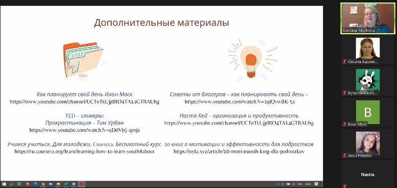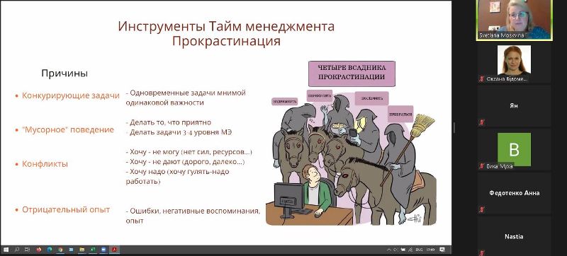 10 грудня 2020 року 28 студентів 2-го курсу, що навчаються за освітніми програмами «Економіка підприємства», «Міжнародна економіка», «Менеджмент» та «Менеджмент персоналу», у Навчально-науковому інституті економіки і управління НУХТ разом із доценткою кафедри економіки і права Оксаною Відоменко долучилися до онлайн-тренінгу «Тайм-менеджмент для учнів і студентів» від Бізнес-школи «КМАН-Граффіт».