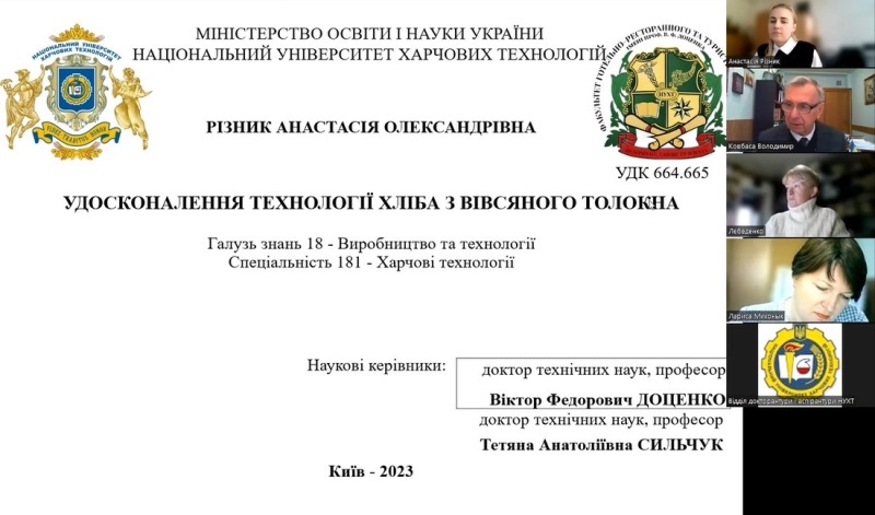 Участь у засіданні брали: голова разової спеціалізованої вченої ради, д.т.н., професор, завідувач кафедри технології хлібопекарських і кондитерських виробів нашого університету Володимир Ковбаса, рецензентки – к.т.н., доцентки кафедри технології хлібопекарських і кондитерських виробів НУХТ Юлія Бондаренко та Лариса Михонік, офіційні опонентки – д.т.н., професорка кафедри готельно-ресторанного бізнесу Одеського національного технологічного університету Тетяна Лебеденко та к.т.н., доцентка, завідувачка кафедри технології харчування Сумського національного аграрного університету Оксана Мельник.