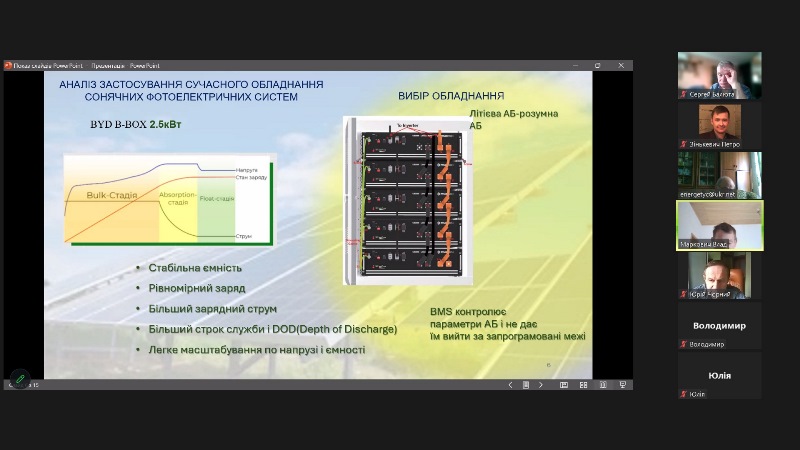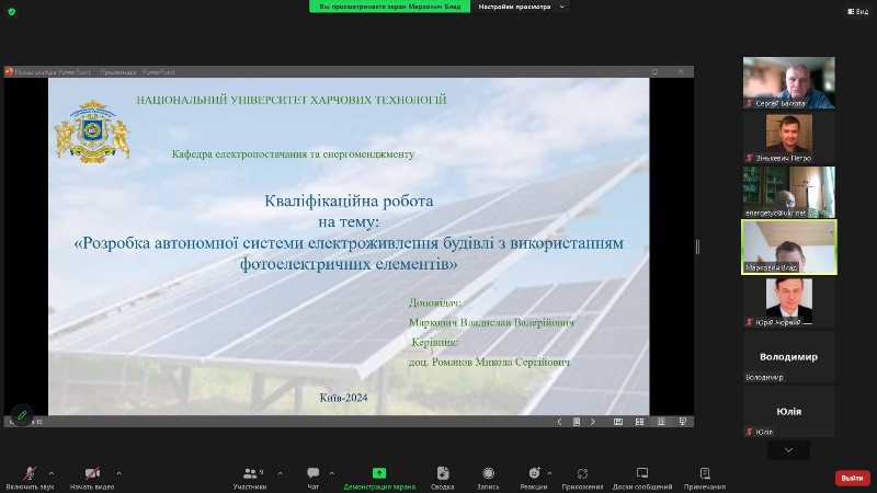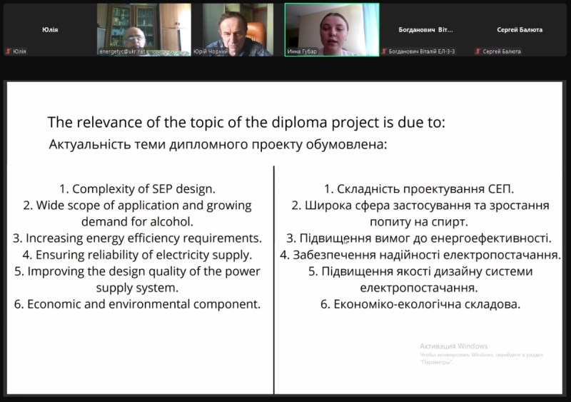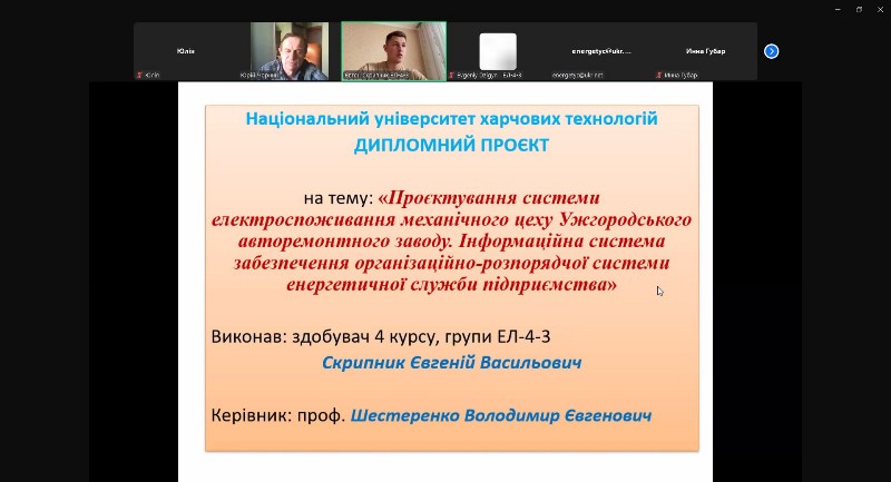 Побажавши здобувачам бакалаврського ступеня успішного захисту, комісія приступила до розгляду дипломних проєктів. Четвертокурсники гідно показали всі свої знання та вміння у вирішенні питань проєктування систем електропостачання промислових споживачів і відновлювальних джерел енергії. А Інна Губар та Ян Яцук захистили свої кваліфікаційні роботи англійською мовою.