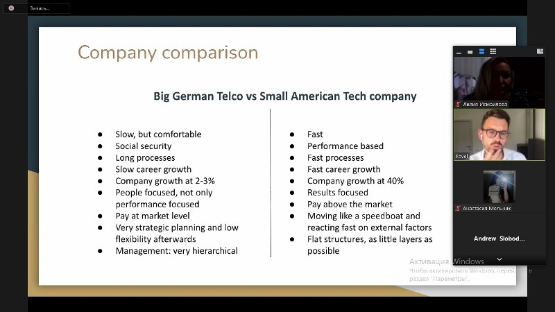 Під час спілкування спікер поділився власним досвідом і зазначив особливості роботи американської компанії «Vonage» на німецькому ринку постачальників комунікаційних послуг, порівняв умови роботи на різних посадах із перевагами та недоліками в німецькій і американській компаніях.