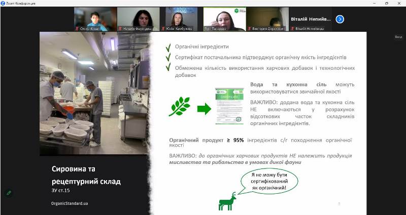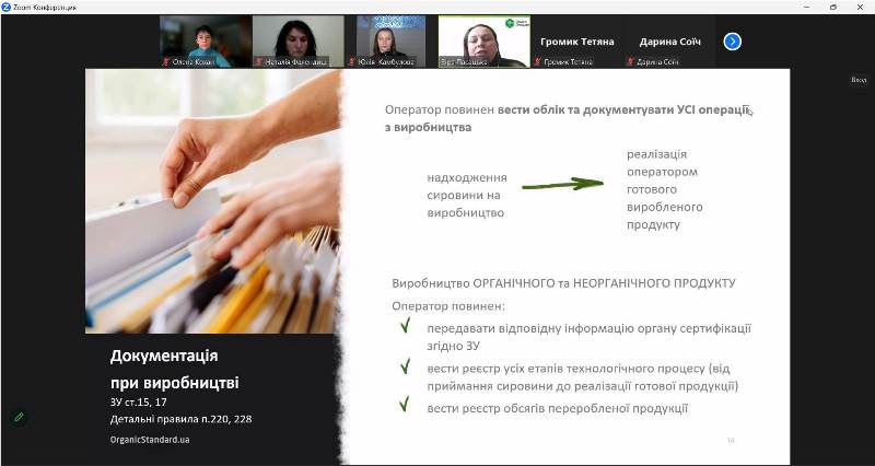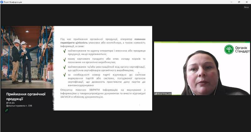 Віра Пасацька акцентувала увагу на важливих принципах виробництва органічних харчових продуктів, їх зберігання та простежуваності на всіх етапах виробництва та реалізації. Зупинилася на важливості заповнення галузевого опису оператора, ознайомила з особливостями маркування органічної продукції за українським законодавством.