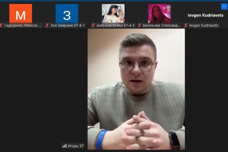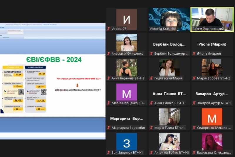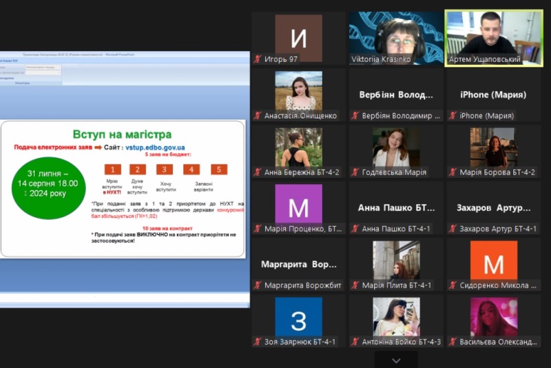 19 березня 2024 року відбулися онлайн-збори студентів випускного, четвертого курсу бакалаврату спеціальності 162 «Біотехнології та біоінженерія», присвячені актуальним питанням вступу до магістратури. Зустріч ініціювала гарантка магістерської освітньо-професійної програми «Промислова та фармацевтична біотехнологія», доцентка Вікторія Красінько за сприяння завідувача кафедри біотехнології і мікробіології, професора Віктора Стабнікова.