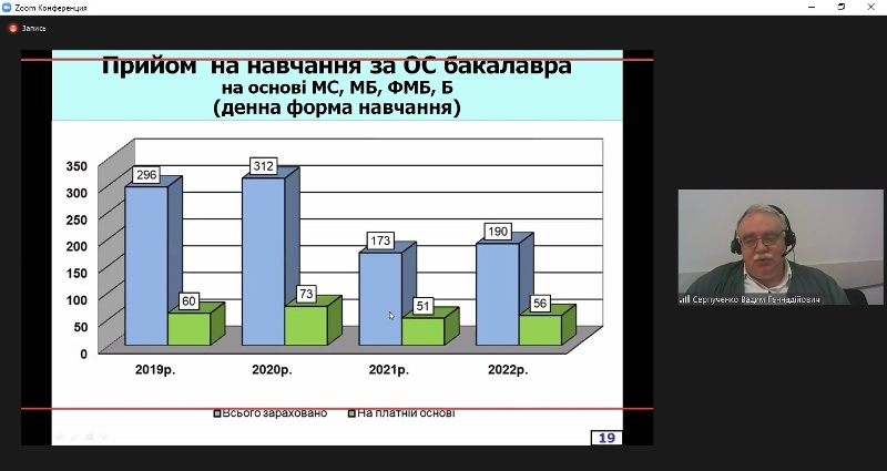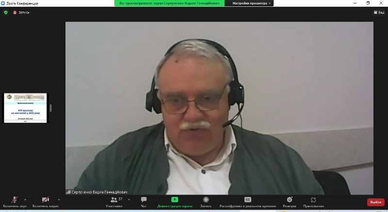Про хід вступної кампанії 2022 року доповів відповідальний секретар приймальної комісії Вадим Серпученко. Фахівець розповів про особливості цьогорічної вступної кампанії і що було змінено в умовах вступу у зв’язку з воєнним станом, про підготовку університету до проведення вступної кампанії, навів обсяги державного замовлення, проінформував про переведення вступників пільгових категорій на вакантні місця, проаналізував статистику по поданих заявах і документах по усіх категоріях вступників і всіх формах навчання.
