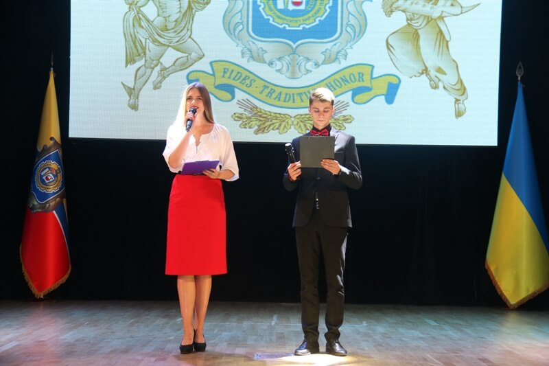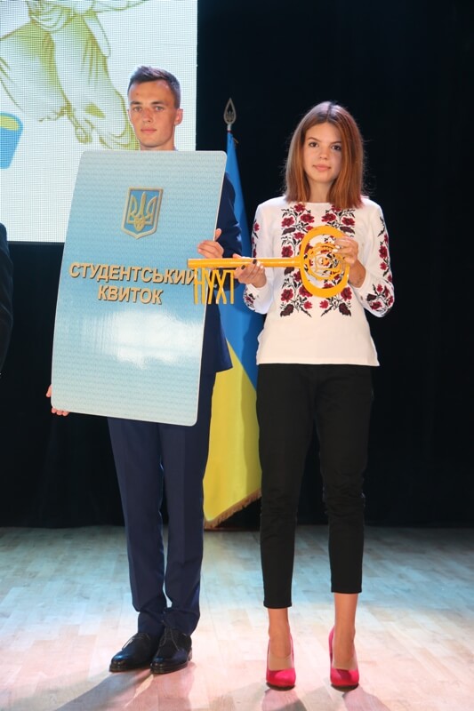 У вирі щирих напутніх слів й мудрих настанов підійшов час вручення студентських атрибутів. Перший проректор Володимир Яровий вручив символічний ключ до знань першокурсниці Навчально-наукового інституту економіки і управління Анастасії Осокіній і студентський квиток – першокурснику Навчально-наукового інституту харчових технологій Костянтину Федорченку. Клятву першокурсника виголосив студент першого курсу факультету готельно-ресторанного та туристичного бізнесу Дмитро Паламар. Завершилася урочиста частина виконанням студентського гімну «Гаудеамус».