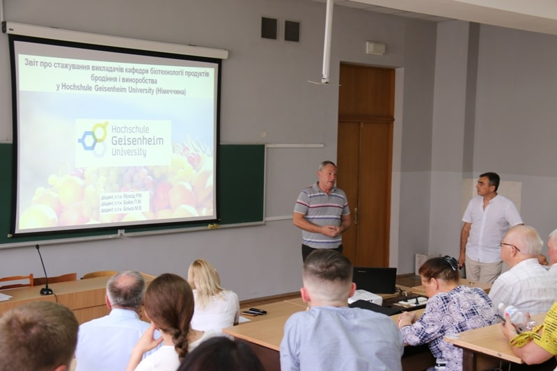 Після активного обговорення почутого, учасники засідання перейшли до другого звіту – делегації кафедри біотехнології продуктів бродіння і виноробства, яка вивчала досвід Університету Гайзенхама (Німеччина). Доценти кафедри Петро Бойко і Роман Мукоїд докладно розповіли про своє стажування у цьому навчальному закладі, в рамках якого ознайомилися із організацією навчального процесу, відвідуючи лекційні, семінарські і лабораторні заняття, захисти студентських наукових проєктів, взявши участь у науковій конференції; набули компетенцій з організації освіти в рамках міжнародних програм, організації навчального процесу англомовних проєктів освітнього ступеню «бакалавр», а також вивчили організацію роботи Інституту вина. Після активного спілкування з головою інтернаціонального офісу університету була досягнута домовленість про спільну участь у проектах програми Еразмус+. Також наших фахівців зацікавили особливості вступу до навчального закладу, специфіка розроблення навчальних планів, аудит якості навчання та умови укладення контракту з професорсько-викладацьким складом. Ця доповідь також була детально обговорена учасниками засідання.