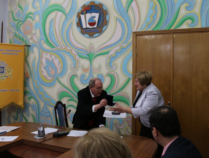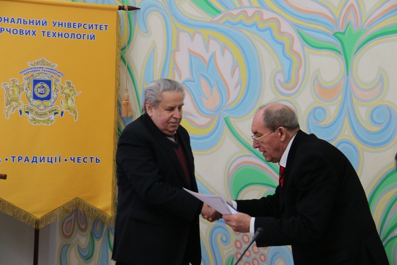 Нагрудні знаки «Відзнака Національного університету харчових технологій» були вручені завідувачу кафедри технічної механіки і пакувальної техніки Анатолію Соколенку і провідному інженеру експлуатаційно-технічного відділу Івану Цабілєву, нагрудний знак «За академічні заслуги» отримала професор кафедри технології хлібопекарських і кондитерських виробів Віра Юрчак. Анатолій Соколенко скористався нагодою й, зазначивши, що працює в нашому навчальному закладі вже 53 роки, подякував колективові за співпрацю й підтримку.
