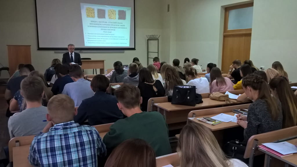 На початку лекції Володимир Ковбаса розповів про переваги високотемпературної екструзії та навів технологічні схеми виробництва екструзійних продуктів. Лектор детально розкрив питання будови екструдерів, їх класифікації та процесів, що відбуваються в різних зонах. Особлива увага була приділена змінам, які відбуваються з біополімерами зерна в процесі екструзійного оброблення. Студентам роз’яснено призначення технологічних операцій та їх параметри, вплив температурних режимів і вологості на хід процесу екструзії та якість готової продукції.