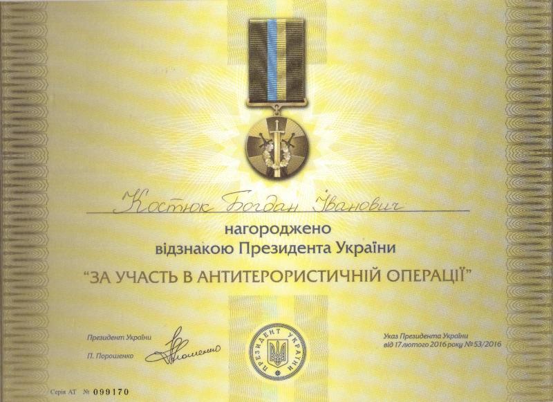 Студент факультету готельно-ресторанного та туристичного бізнесу, учасник бойових дій Богдан Костюк нагороджений відзнакою Президента України «За участь в антитерористичній операції».