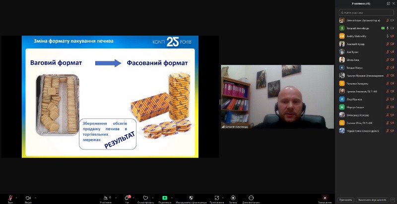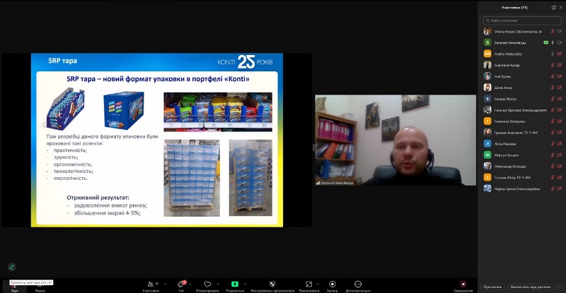 Лектор ознайомив здобувачів із основними принципами компанії та детально розповів про вплив сучасних способів пакування різних груп кондитерських виробів на їх якість і конкурентоспроможність. Зупинився на особливостях впровадження SRP-тари для пакування продукції компанії та навів переваги цього формату пакування.