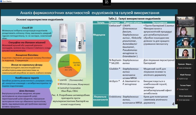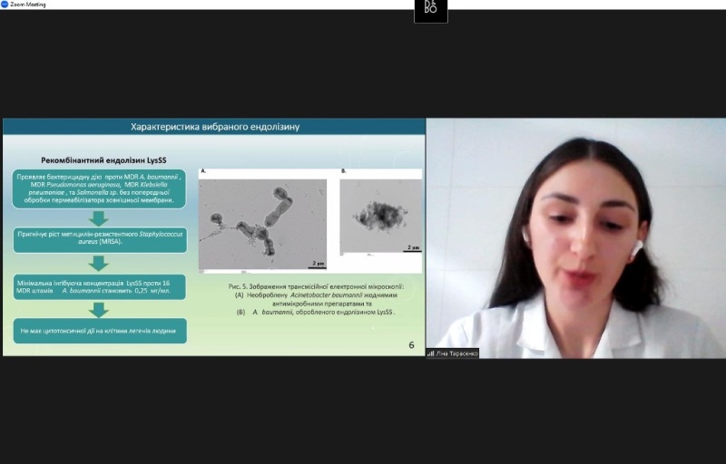 Ліна Тарасенко доповіла про антибактеріальний потенціал та перспективи біотехнологічного одержання ендолізинів, які є альтернативними терапевтичними засобами для лікування бактеріальних інфекцій.