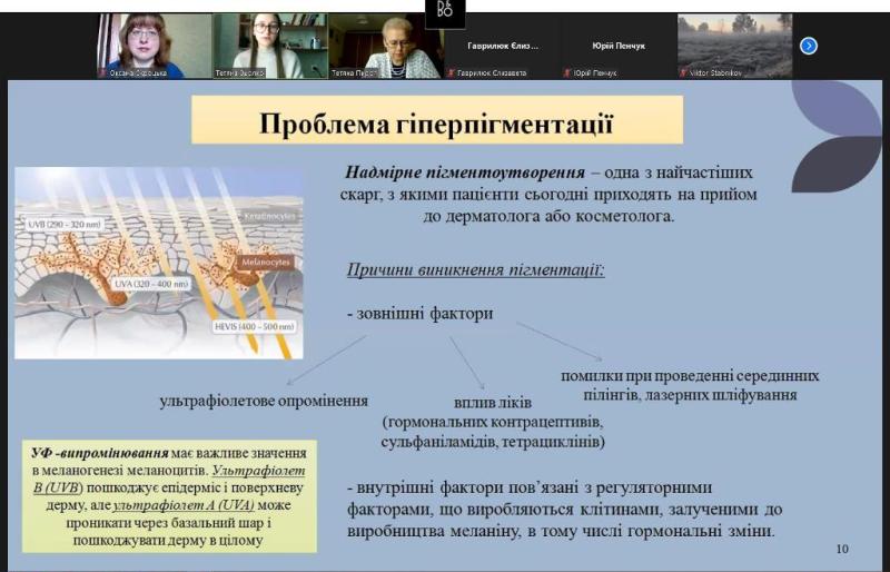 Тетяна Зьолко зробила доповідь, що стосувалася ферментативного синтезу біологічно активних речовин (БАР) для космецевтики. Наявність БАР у складі космецевтики дає змогу ефективно та безпечно лікувати певні дефекти шкірного покриву: передчасне старіння шкіри, пігментацію, вугрі, зниження тонусу та пружності шкіри тощо, здатних викликати захворювання у людей з ослабленим імунітетом.