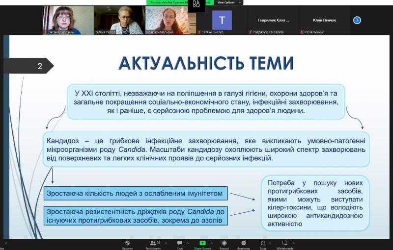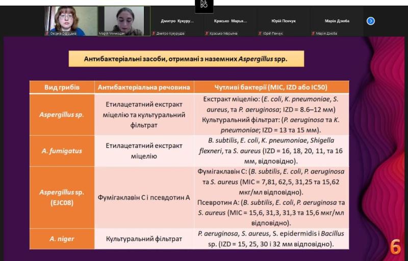 Доповідь магістрантки Марії Парфенюк була присвячена пошуку нових підходів щодо регуляції біологічної активності практично цінних поверхнево-активних речовин (ПАР). Під час досліджень вона встановила, що внесення живих або інактивованих дріжджових клітин чи відповідного супернатанту у середовище культивування бактеріального продуцента дає змогу підвищити антиадгезивну активність синтезованих ПАР щодо дріжджів роду Candida. До речі Марія є переможницею минулорічного конкурсу студентських наукових робіт за благодійної підтримки Корпорації «Артеріум».