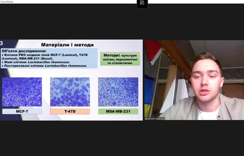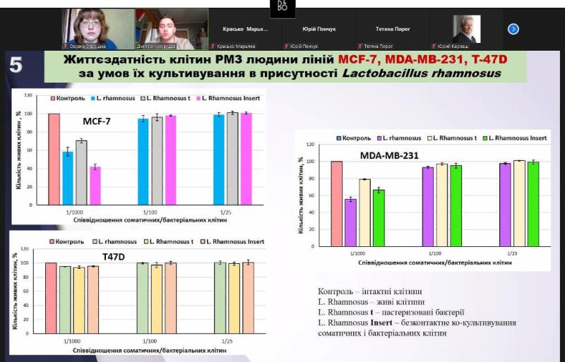 Дмитро Кукурудза представив роботу з дослідження впливу лактобактерій на життєздатність і рівень апоптозу в клітинах раку молочної залози людини. Було встановлено, що безпосередня взаємодія живих бактеріальних клітин Lactobacillus rhamnosus і клітин раку молочної залози призводить до найбільш значного впливу на життєздатність злоякісних клітин, порівняно з їх безконтактним ко-культивуванням або використанням інактивованих бактерій.