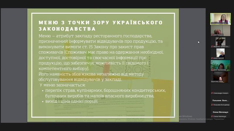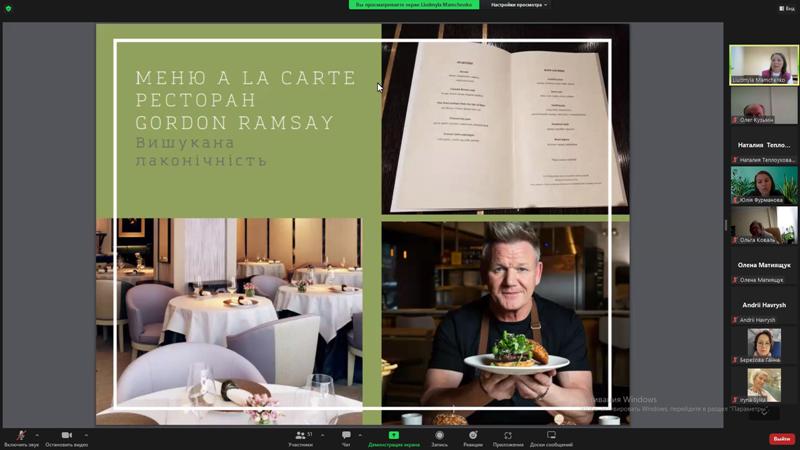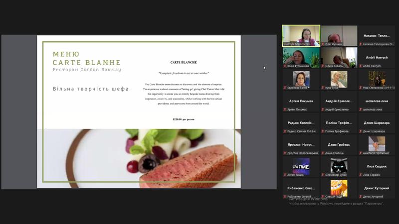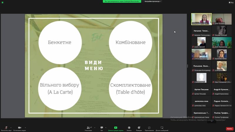 Викладачка побудувала логічну схему лекційного заняття, забезпечила єдність викладання теоретичного та практичного матеріалу. У яскравій, доступній формі надала визначення меню та навела його класифікацію (з урахуванням вітчизняної та іноземної практик). У рамках виконання плану лекції були розглянуті підходи та принципи формування меню, особливості та переваги електронного меню.