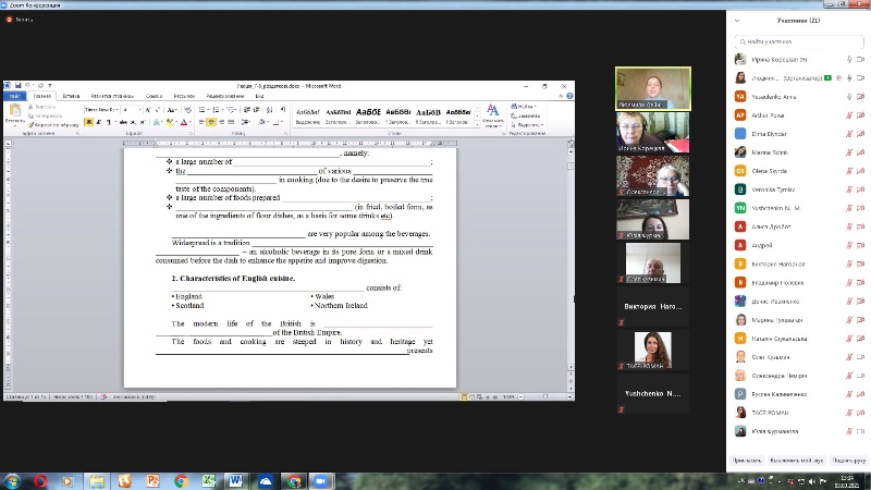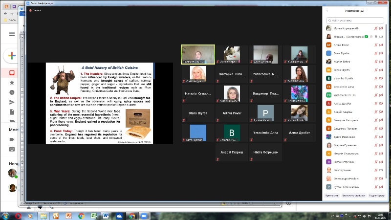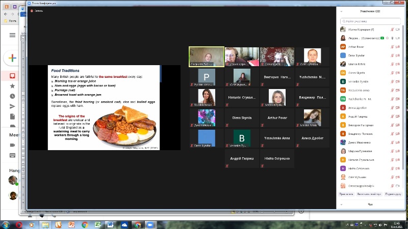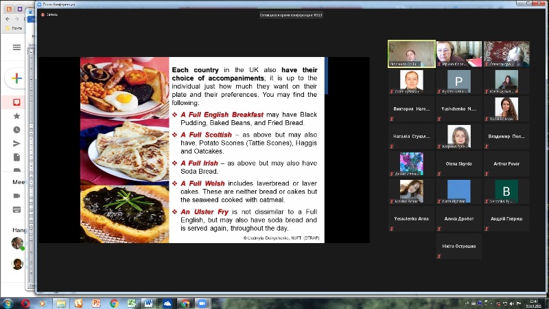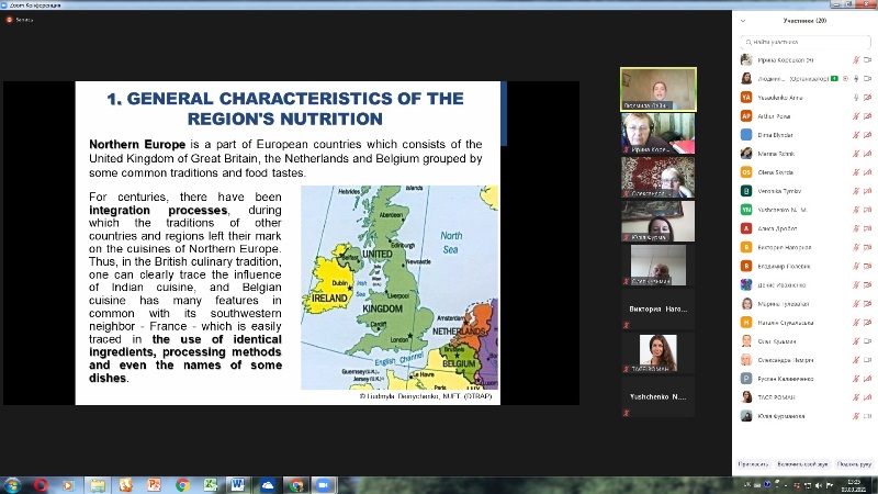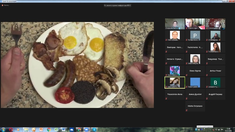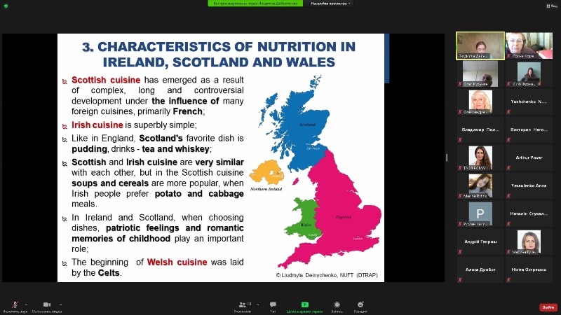 Здобувачі вищої освіти дізналися про загальні особливості харчування регіону та про харчування у Великій Британії. Людмила Дейниченко ознайомила слухачів із історією формування харчових звичок британців, характерними рисами англійської кухні, специфікою харчування регіонів (Шотландії, Північної Ірландії та Уельсу).