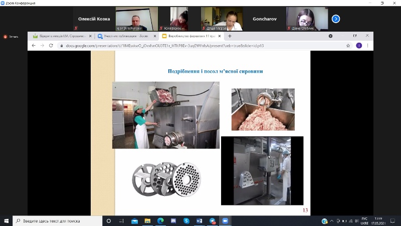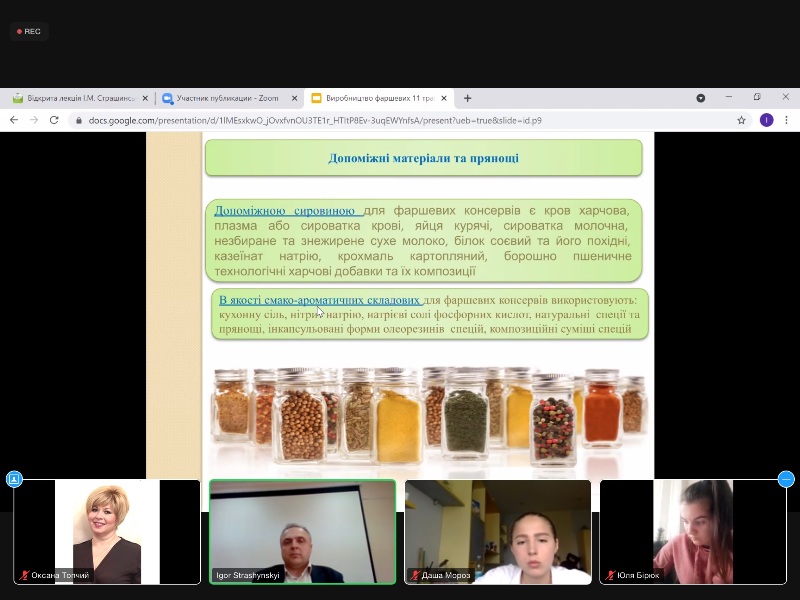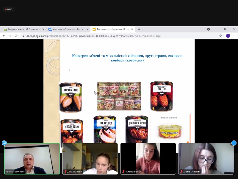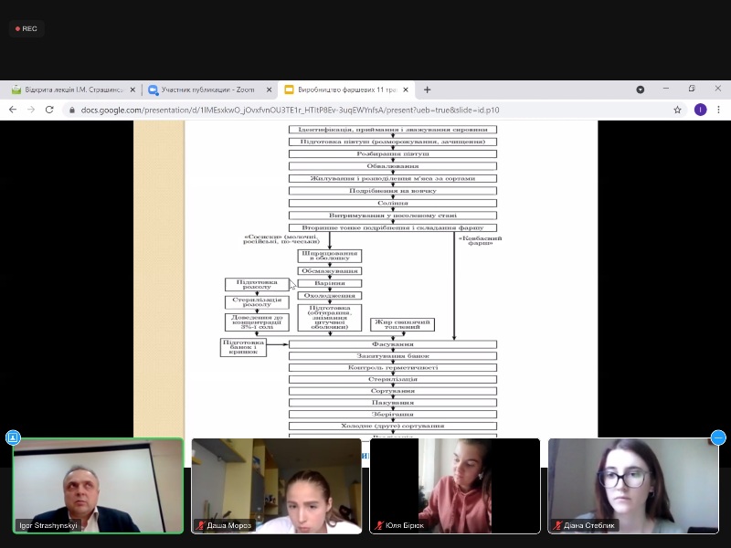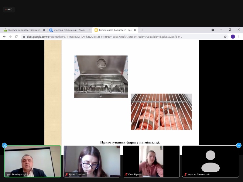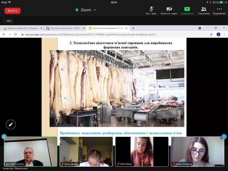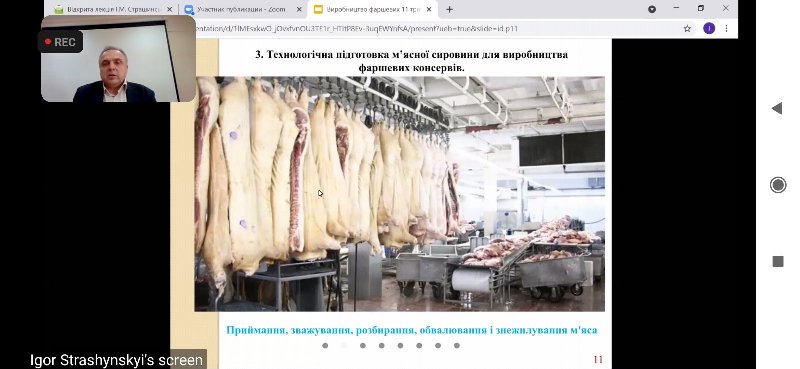 Заняття відбулося в режимі конференції ZOOM, до якого приєдналися завідувач і викладачі кафедри технології м’яса і м’ясних продуктів.
