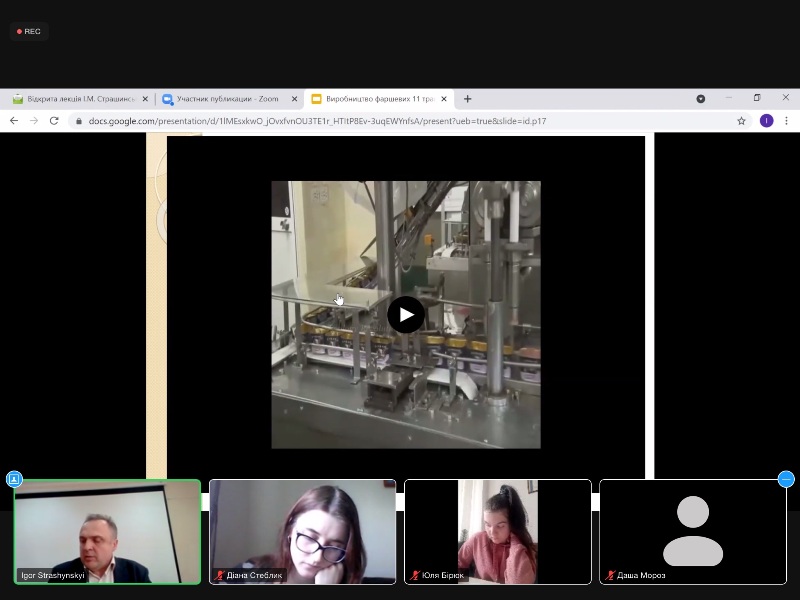 Згідно з планом проведення відкритих занять 17 травня відбулася відкрита лекція «Технології фаршевих консервів» доцента кафедри технології м’яса і м’ясних продуктів Ігоря Страшинського з навчальної дисципліни «М’ясні технології. Модуль 2. Технології м'ясних і м'ясомістких консервів» для здобувачів третього курсу спеціальності «Харчові технології» Навчально-наукового інституту харчових технологій.