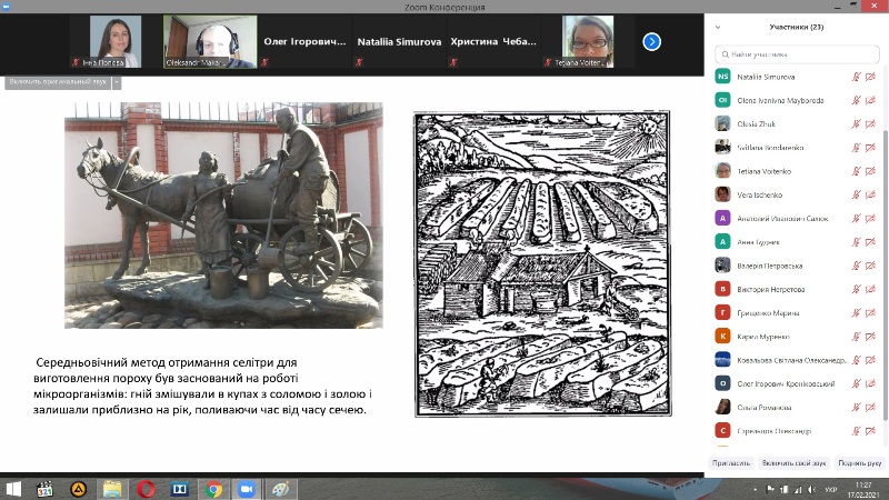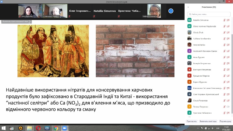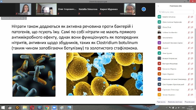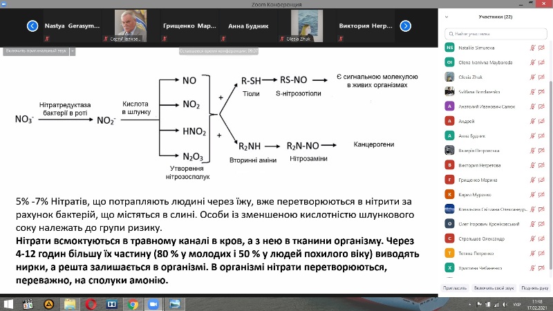 Лектор розпочав заняття з повторення хімічного визначення нітратів, їх промислового та фізіологічного значення. Була надана історична довідка добування селітри, застосування у якості консерванта, починаючи зі Стародавньої Індії та Китаю, Давньої Греції, середньовічної Німеччини. Викладач звернув увагу, що сучасні відомі поклади селітри знаходяться в Чілі. Далі детально було розглянуто хімізм покращення зовнішнього вигляду м’ясних виробів за допомогою нітратів та їх антибактеріальна дія. Доцент зосередив увагу слухачів на основних причинах токсичності нітратів, граничних концентраціях і дозах, симптомах і фізіологічних наслідках отруєння нітрогенвмісними сполуками. Окрему увагу лектор присвятив джерелам забрудненості води, нормам вмісту нітратів у різних продуктах, дитячих сумішах. Слухачі були здивовані різницею граничних норм вмісту нітратів в інших країнах.