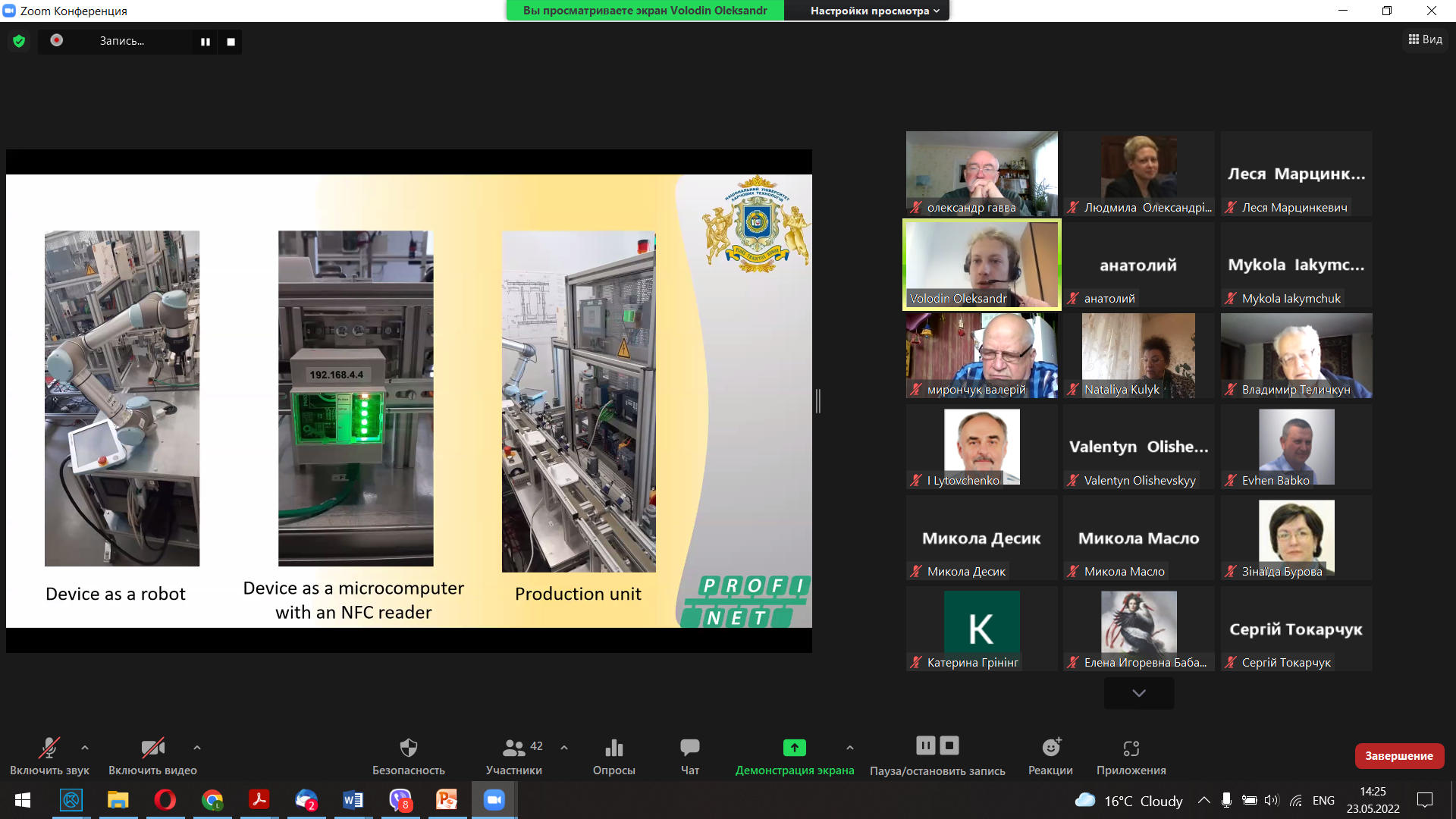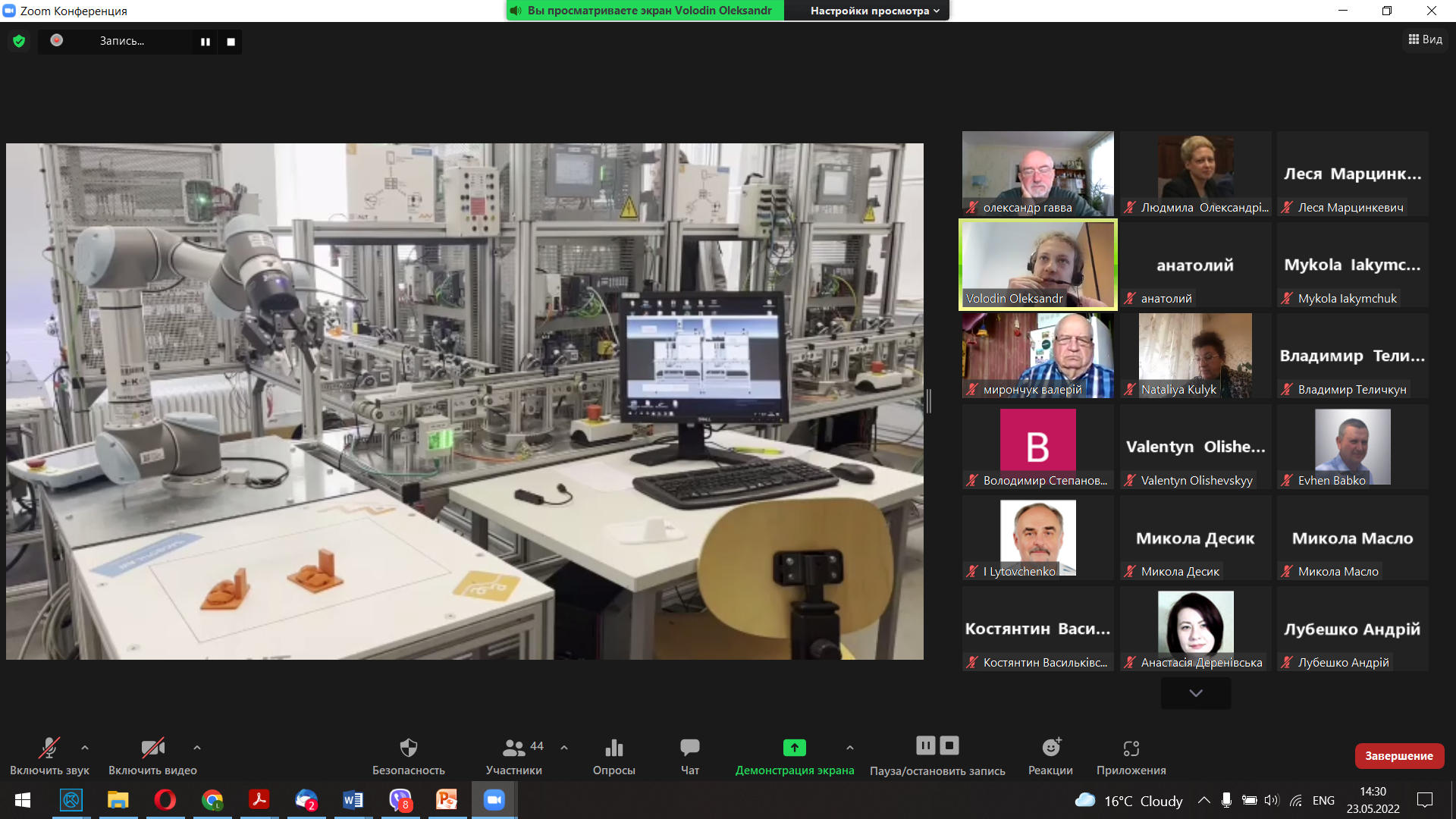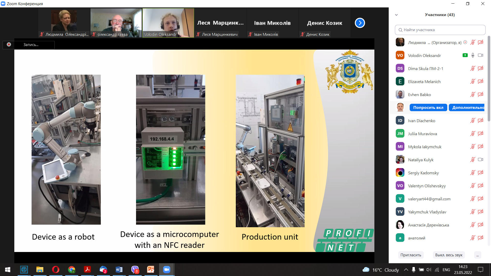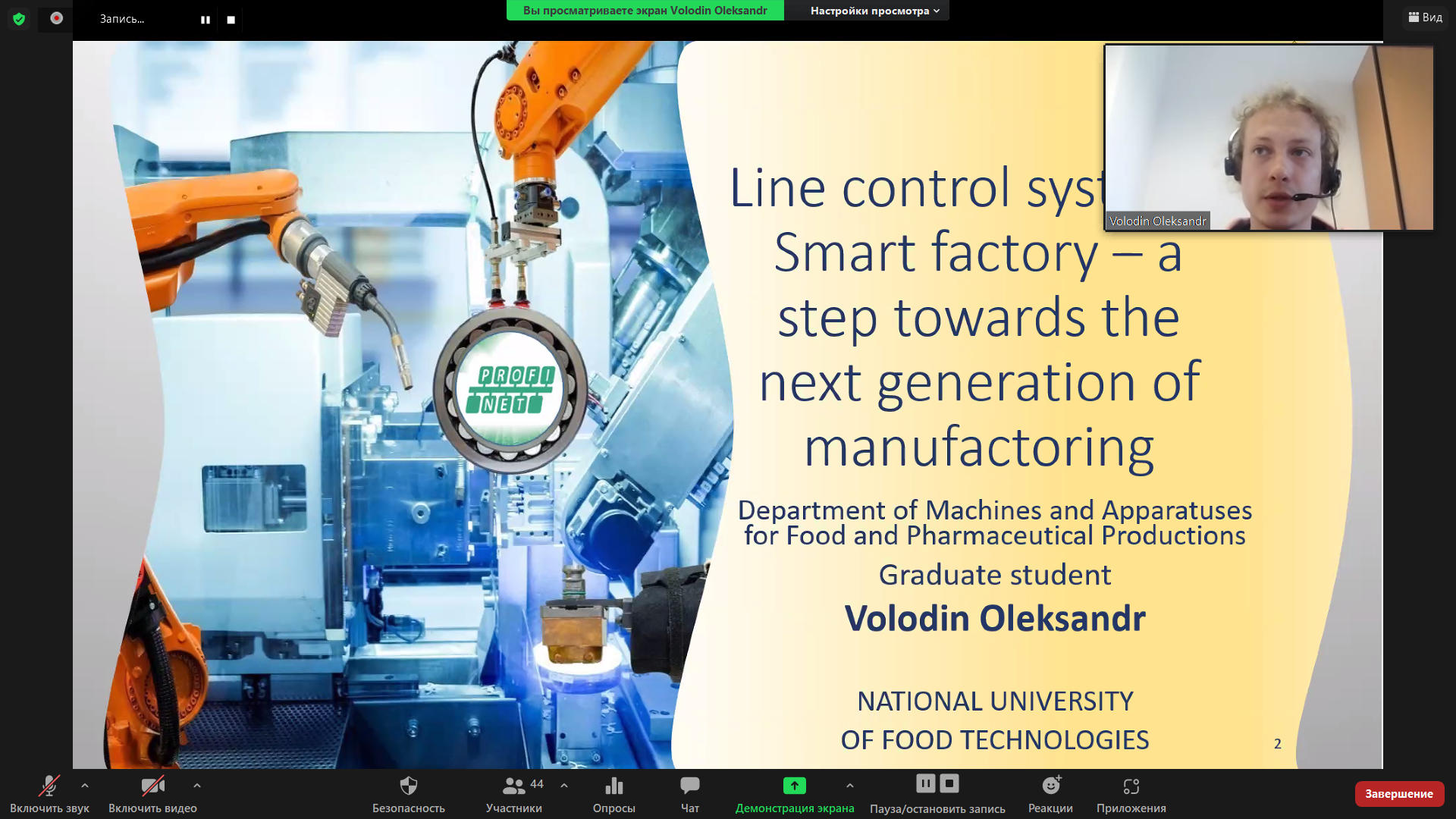 Як елемент педагогічної практики в нашому університеті під час підготовки здобувачів освіти рівня PhD, майбутні фахівці читають відкриті лекції. Не виняток і аспіранти за напрямом 133 «Галузеве машинобудування». У рамках курсу «Автоматизовані потокові лінії» для здобувачів освітнього ступеня «магістр» 23 травня 2022 року аспірант кафедри машин і апаратів харчових і фармацевтичних виробництв Навчально-наукового інженерно-технічного інституту ім. І.С.Гулого Олександр Володін представив сучасні матеріали на тему: «Line control systems. Smart factory – a step towards the next generation of manufactoring».